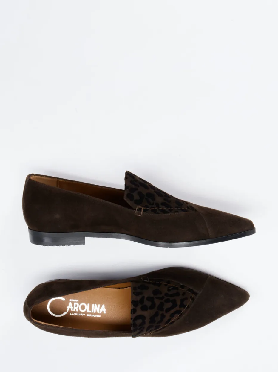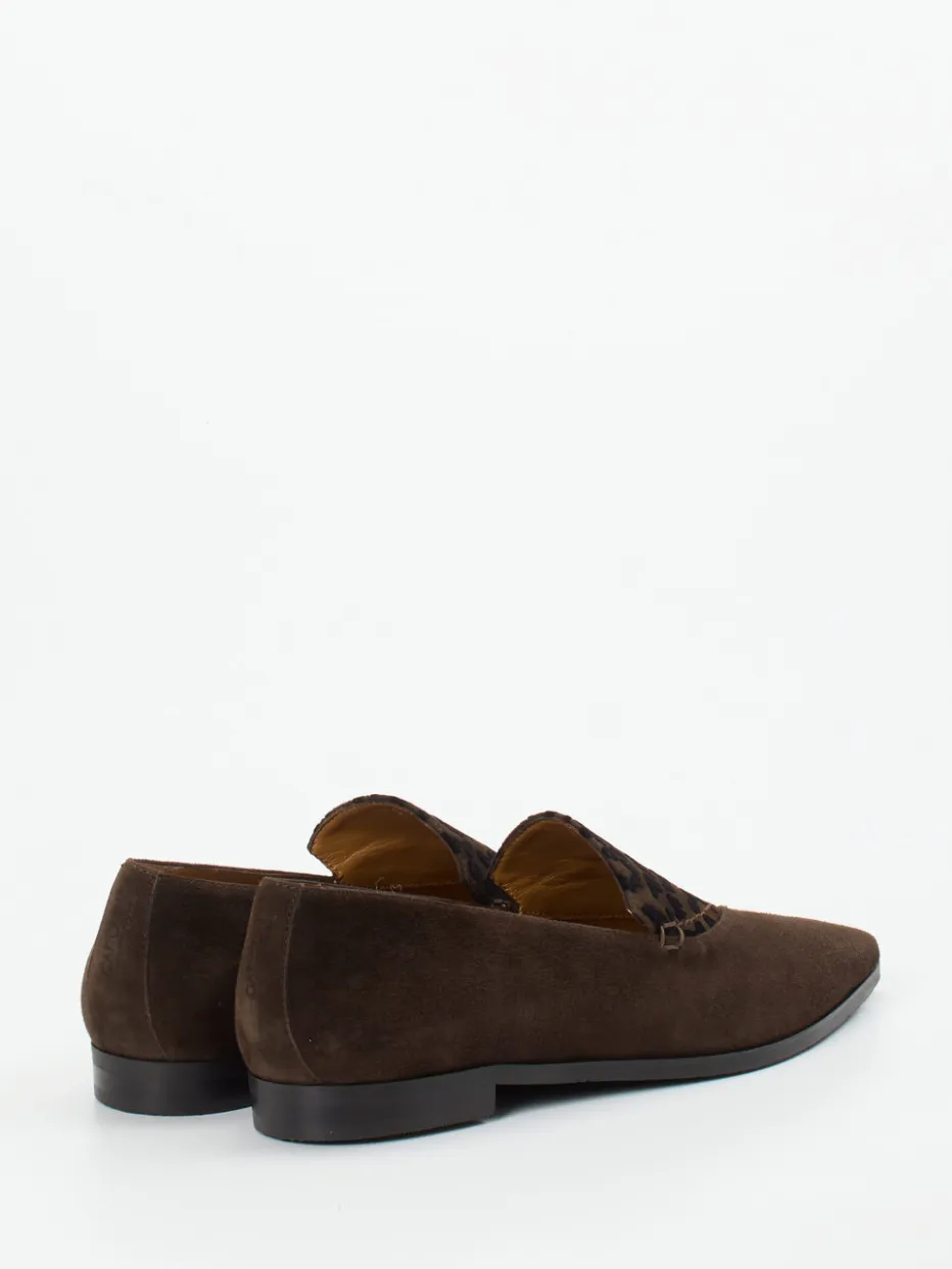 Ob im Büro oder beim Stadtbummel – dieser Slipper begeistert durch seine spitz zulaufende Form und die matte Oberfläche aus hochwertigem Veloursleder. Das dunkelbraune Leder wird durch eine Zunge mit strukturiertem Leoprint stilvoll ergänzt und betont die trendbewusste Ausstrahlung. Ein gepolstertes Kalblederfutter sorgt für angenehmen Tragekomfort, die flache Gummisohle bietet sicheren Halt. Elemente wie Animal Print und klare Linien setzen ein modisches Statement im Rahmen von „Quiet Luxury“ und „Vintage 90s“.