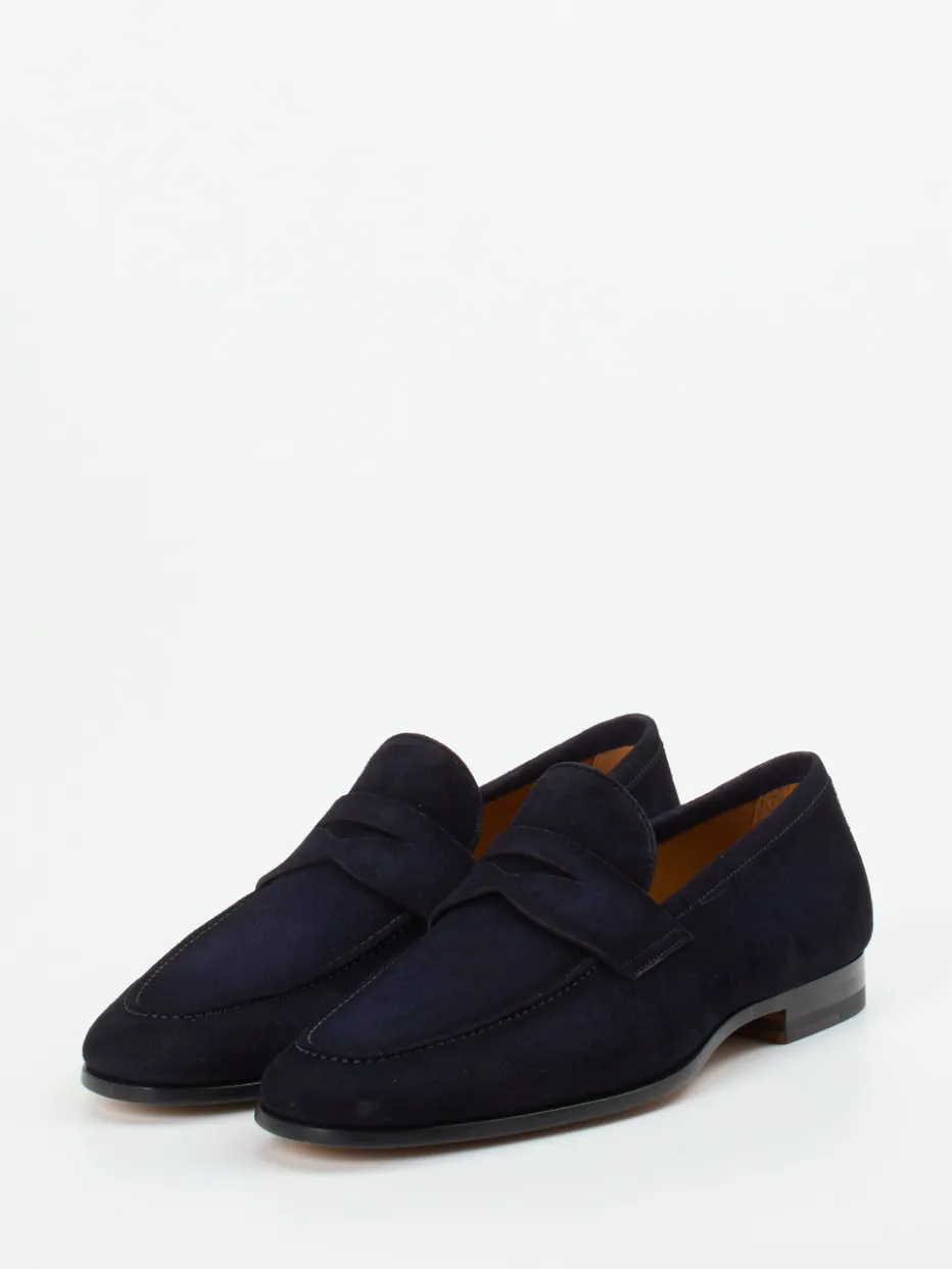 Elegant bei jedem Schritt.Magnanni zeigt mit diesem Herren-Loafer ein stilvolles Modell zwischen klassischer Zurückhaltung und moderner Linienführung. Für urbane Business-Styles oder gepflegten Alltagskomfort überzeugt dieser Loafer nicht nur optisch. Das dunkelblaue Veloursleder fasziniert durch seine samtige Oberfläche, die Ton-in-Ton-Nähte unterstreichen die minimalistische Handschrift. Das Kalbleder-Innenfutter sowie die flexible Ledersohle garantieren Tragekomfort auf hohem Niveau. Die klassische, schmal geformte Silhouette mit Zunge und Banddurchzug verweist auf italienische Leichtigkeit. Ein Favorit für Fans des „Quiet Luxury“-Looks. Puristische Ästhetik und exzellente Verarbeitung prägen den Markencharakter von Magnanni.