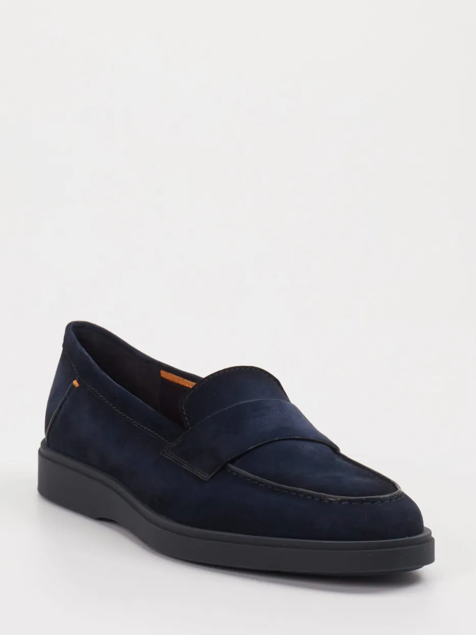 Perfekt für den smarten Alltag zwischen Büro und Freizeit überzeugt das Modell mit seiner matt strukturierten Oberfläche und einem dezenten Dunkelblau. Die tonalen Ziernähte und kontrastierenden Details in Orange verleihen dem Schuh dezenten Charakter. Komfortabel wird es durch die flache Gummisohle und die Schlupfform, während das orangefarbene Innenfutter modern akzentuiert. Der Loafer passt ideal zu Chinos oder schmal geschnittenen Stoffhosen und folgt dem Trend des ‚Quiet Luxury‘.