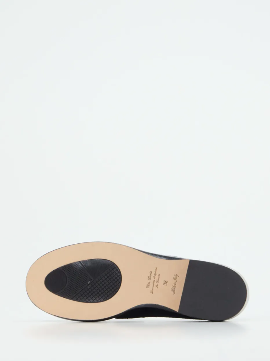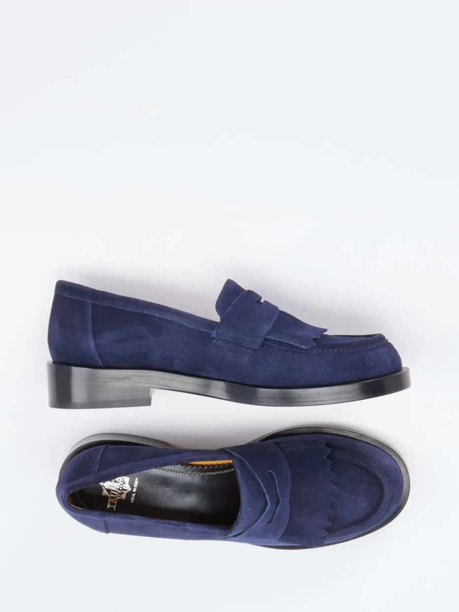 Der klassische Loafer von Truman’s überzeugt durch samtiges Veloursleder in Dunkelblau und ein charakteristisches Fransen-Detail – stilvoll, feminin und modern interpretiert.