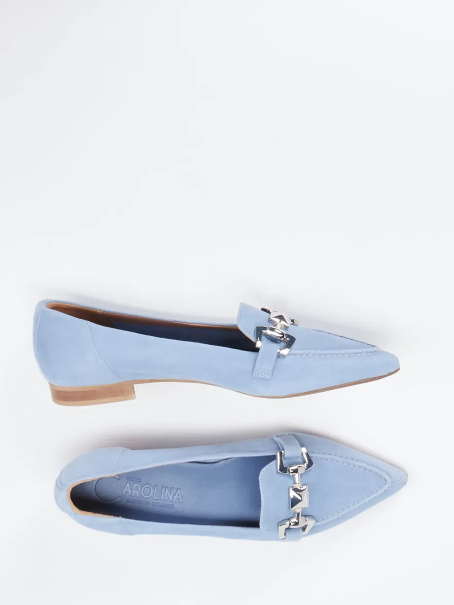 Wenn gepflegte Alltagslooks oder Business-Casual-Outfits verlangt sind, überzeugt dieses Modell mit seinem hellblauen, samtig mattierten Veloursleder. Die spitze Leistenform wirkt feminin und modern zugleich, während die silberfarbene Zierkette im Pyramidennieten-Stil als markanter Akzent hervorsticht. Die Mokassinnaht verleiht handwerkliche Raffinesse, das ungefütterte Design sowie das weiche Ziegenleder-Fußbett erhöhen den Komfort. Die flache Gummisohle und der leichte Blockabsatz runden das Preppy-Chic-Design funktional ab. Kombinationsempfehlung: ideal zu Stoffhose oder Ledertasche in hellen Tönen.
