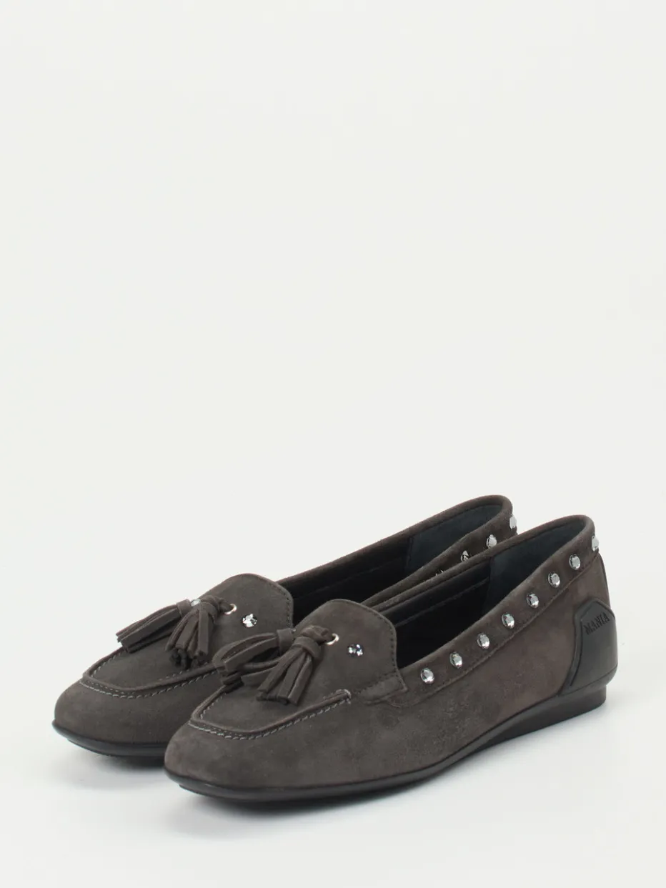 Moderner Klassiker mit dezentem Glanz.Mania präsentiert einen Damen-Loafer, der klassische Linien mit feinen Details vereint. Ideal für Büro und Alltag: Dieser Slipper aus samtig angeschliffenem Veloursleder in Anthrazitgrau wird durch glitzernde Schmucknieten entlang des umlaufenden Schaftrands sowie tonige Quasten auf dem Blatt modern inszeniert. Die flache Silhouette mit dezenter Mokassinnaht, ein bequemes Fußbett und die flexible, rutschhemmende Gummisohle garantieren hohen Tragekomfort. Das matte Finish betont den hochwertigen Charakter. Ein Modell im Einklang mit dem Trend zu „Quiet Luxury“ und Casual Chic – kombinierbar mit dunkler Skinny-Jeans oder Hosenanzügen. Mania verbindet langlebige Bequemlichkeit mit stilsicherem Design.