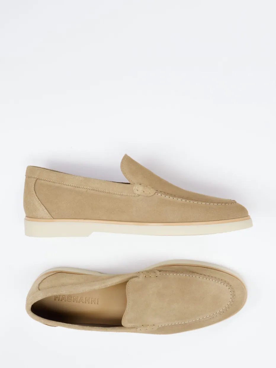 Leichter Stil für warme Tage.Magnanni präsentiert einen klassischen Herren-Loafer aus Veloursleder mit eleganter Zurückhaltung. Für entspannte Büro- oder Freizeitmomente kombiniert dieses Modell taupefarbenes, samtig angeschliffenes Veloursleder mit einer flexiblen Gummisohle in Cremeweiß. Die flache, niedrig geschnittene Form und Ton-in-Ton-Nähte unterstreichen den ruhigen Charakter. Eine angedeutete Mokassinnaht sowie das geprägte Innenlogo setzen dezente Akzente. Die Schlupfform ist funktional, das designprägende Farbkonzept harmoniert mit „Soft Neutrals SS24“. Ideal zu Chinos und Feinstrick. Ein stilbewusster Begleiter mit leichter Konstruktion und smartem Komfortanspruch.