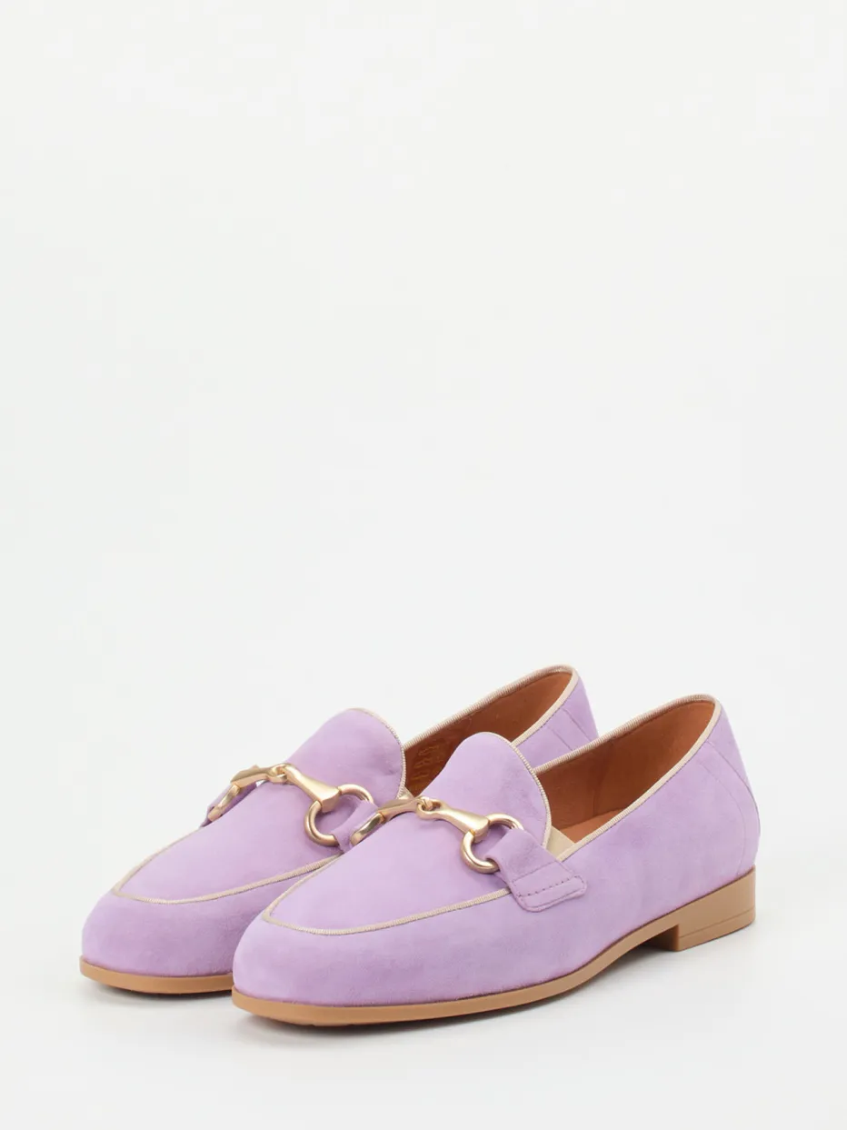 Der klassische Damen-Loafer verbindet weiches Veloursleder mit edlen Details und liegt mit zartem Fliederton ganz im Trend der Saison. Ideal für stilbewusste Alltags-Looks zwischen Minimalismus und Raffinesse.
