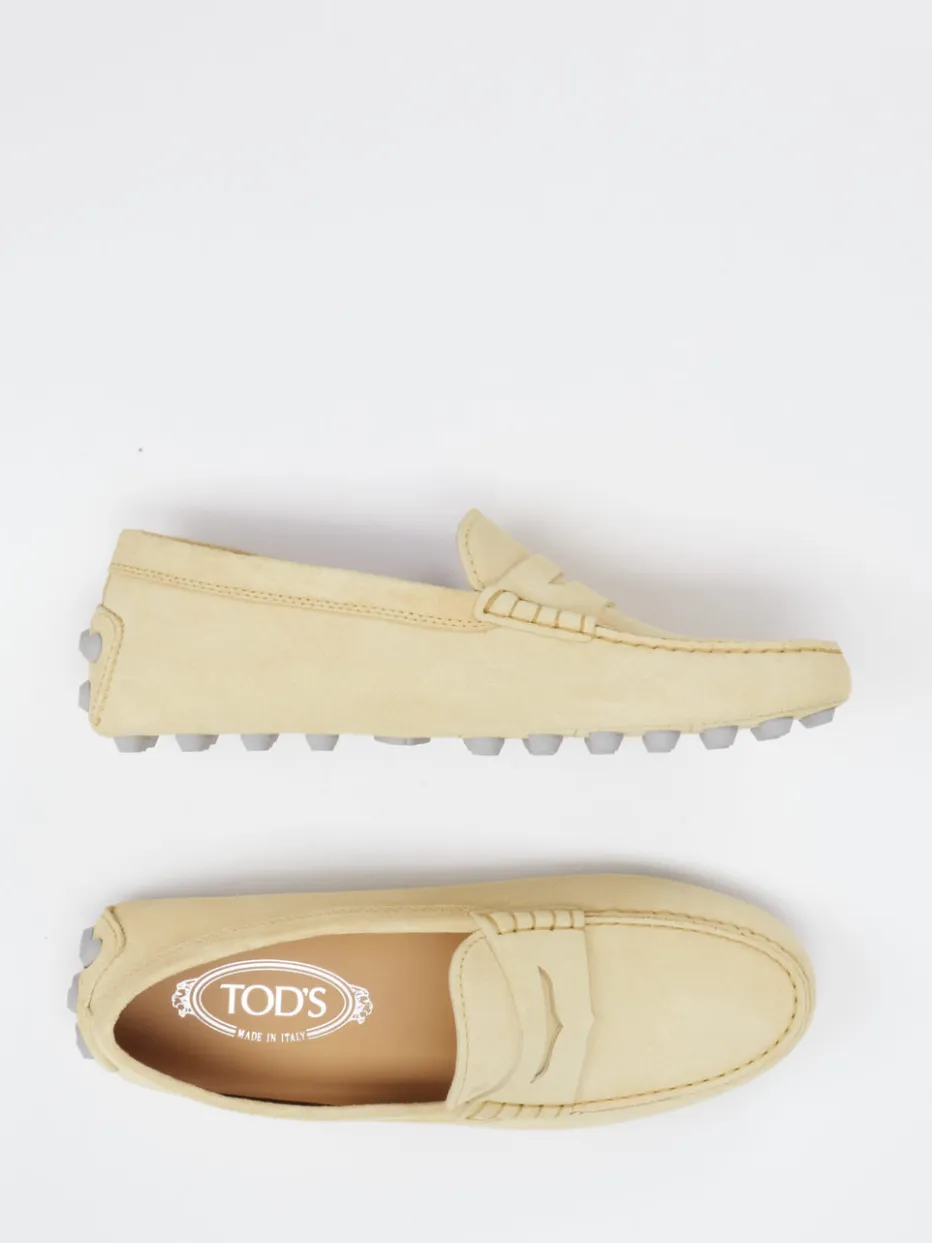 Mit seinem hochwertigen Veloursleder und der glatten, matten Oberfläche fügt sich das Modell nahtlos in minimalistische Sommerlooks ein. Das helle Gelb unterstreicht die cleane Silhouette mit Mokassin-Naht und geprägtem Logo auf dem Blatt. Für angenehmen Halt sorgt die griffige Gummisohle mit charakteristischer Noppenstruktur. Die schlupfbare Form erhöht den Komfort, während klassische Linienführung und dezentes Design dem „Quiet Luxury“-Look folgen. Ideal zu Leinenhosen oder tonalen Outfits.