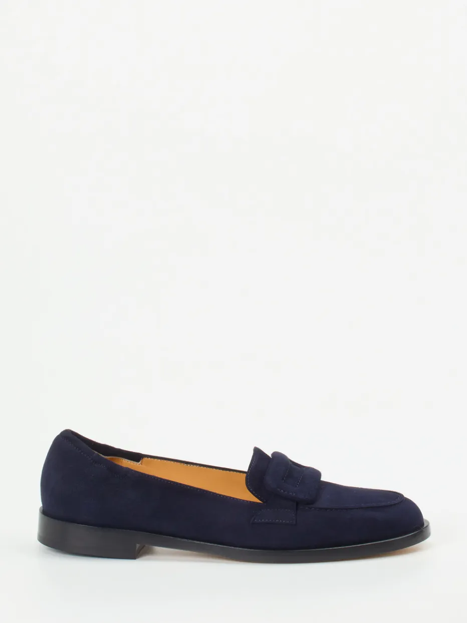 Ob im Office oder beim Stadtbummel – das samtig-matte Veloursleder in Marineblau verbindet hochwertigen Look mit dezenter Aussagekraft. Ein tonaler Zierschlaufenakzent und die markante Mokassinnaht unterstreichen den zeitlosen Charakter. Die flache Silhouette und das cognacfarbene Innenfutter aus Lammnappa schaffen Komfort und Raffinesse. Die halb gummierte Ledersohle sorgt für sicheren Stand und urbanen Stil. Ideal für schlichte Kombinationen mit Blazer oder Culotte.