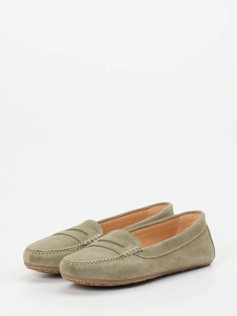 Die italienische Marke Unützer präsentiert einen hochwertig gearbeiteten Damenloafer aus anschmiegsamem Veloursleder. Das Modell zeigt sich in einem schmeichelnden Salbeigrün mit matter Oberfläche und tonalen Ziernähten.