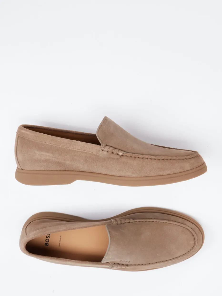 Stilvoll in jeder Situation.Boss präsentiert mit diesem Loafer ein elegantes Herrenmodell für den modernen Alltag. Wenn ein Schuh sowohl zum Casual-Friday-Outfit als auch zur Chino passt, ist Vielseitigkeit garantiert. Gefertigt aus sandbeigem Veloursleder mit samtig-matter Oberfläche, überzeugt das Modell durch eine klassische, flache Silhouette und eine Mokassin-Naht als dezentes Designmerkmal. Die flexible Schlupfform, das gepolsterte Lederfutter und die tonale Gummisohle bieten angenehmen Komfort. Das aufgeprägte Seitenlogo rundet das Understatement-Design im Stil des „Quiet Luxury“ ab. Kombiniert zu Creme- oder Cognac-Nuancen entsteht ein stimmiger Sommerlook. Klarer Stil mit zurückhaltendem Luxus – markentypisch Boss.