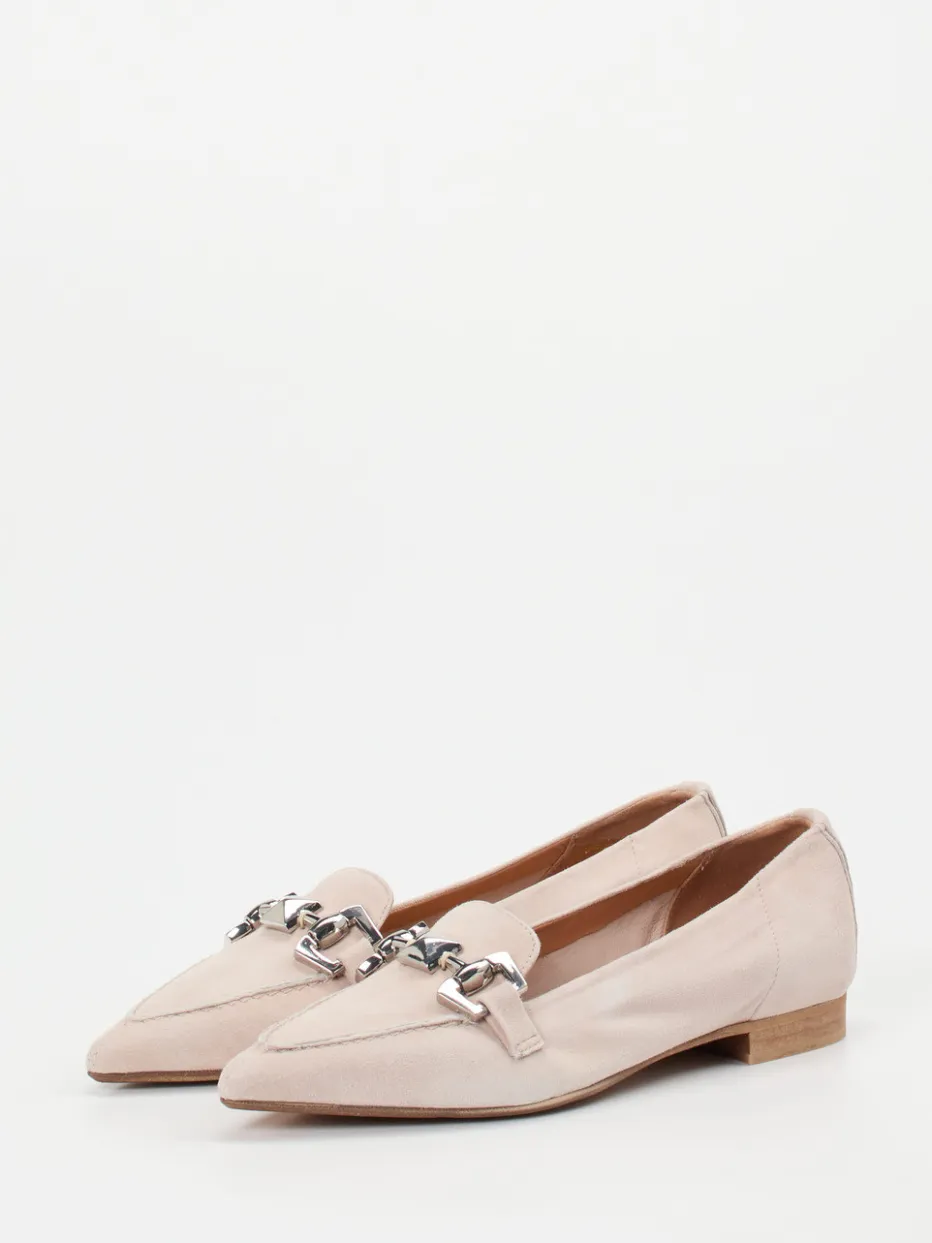 Feines Veloursleder in zartem Rosa trifft auf eine spitz zulaufende Silhouette mit edler Trensenkette – ein Loafer, der zeitlosen Chic neu interpretiert.