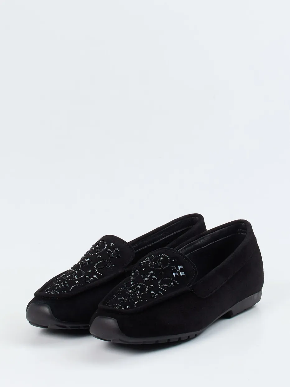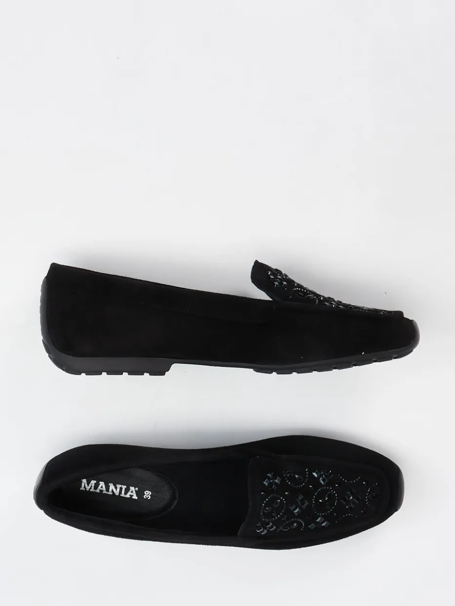 Schwarzer Loafer mit Understatement.Die Marke Mania präsentiert mit diesem Damenslipper ein klassisches Modell mit modernem Feingefühl. Ideal für lange Tage im Büro oder entspannte Stadtausflüge bietet der Loafer eine weiche Verarbeitung aus feinem Veloursleder, das samtig angeschliffen wirkt. Das tiefschwarze Design mit Ton-in-Ton Applikationen und Glanzeffekt bleibt dezent, aber edel. Ein flauschiges Fleecefutter sorgt innen für angenehme Wärme, während die flexible Profilsohle mit leichter Erhöhung zuverlässigen Halt gibt. Schlupfform, klassische Silhouette und Mokassinnaht unterstreichen den stilvollen Minimalismus. Lassen sich vielseitig zu Tonal-Looks kombinieren. Mania verbindet handwerkliche Wertigkeit mit kontemporärem Comfortdesign.