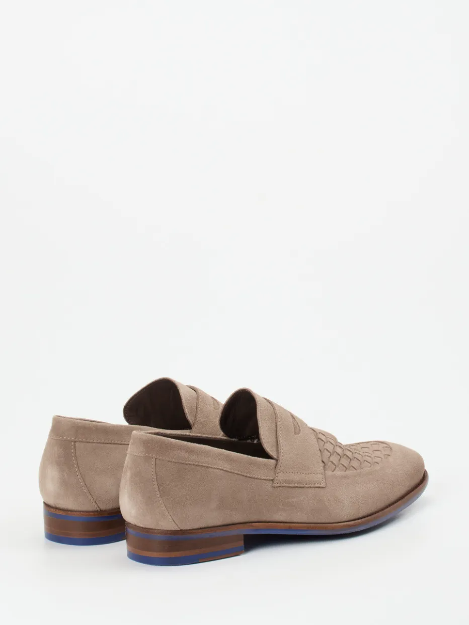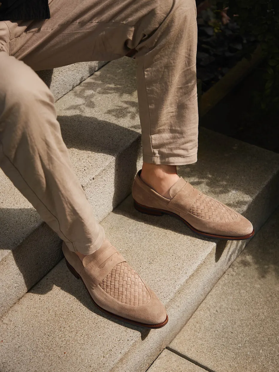Ein Herren-Loafer, der klassische Form mit moderner Flechtoptik und farblichem Kontrast kombiniert – präzise gefertigt, ideal für stilvolle Sommer-Outfits.
