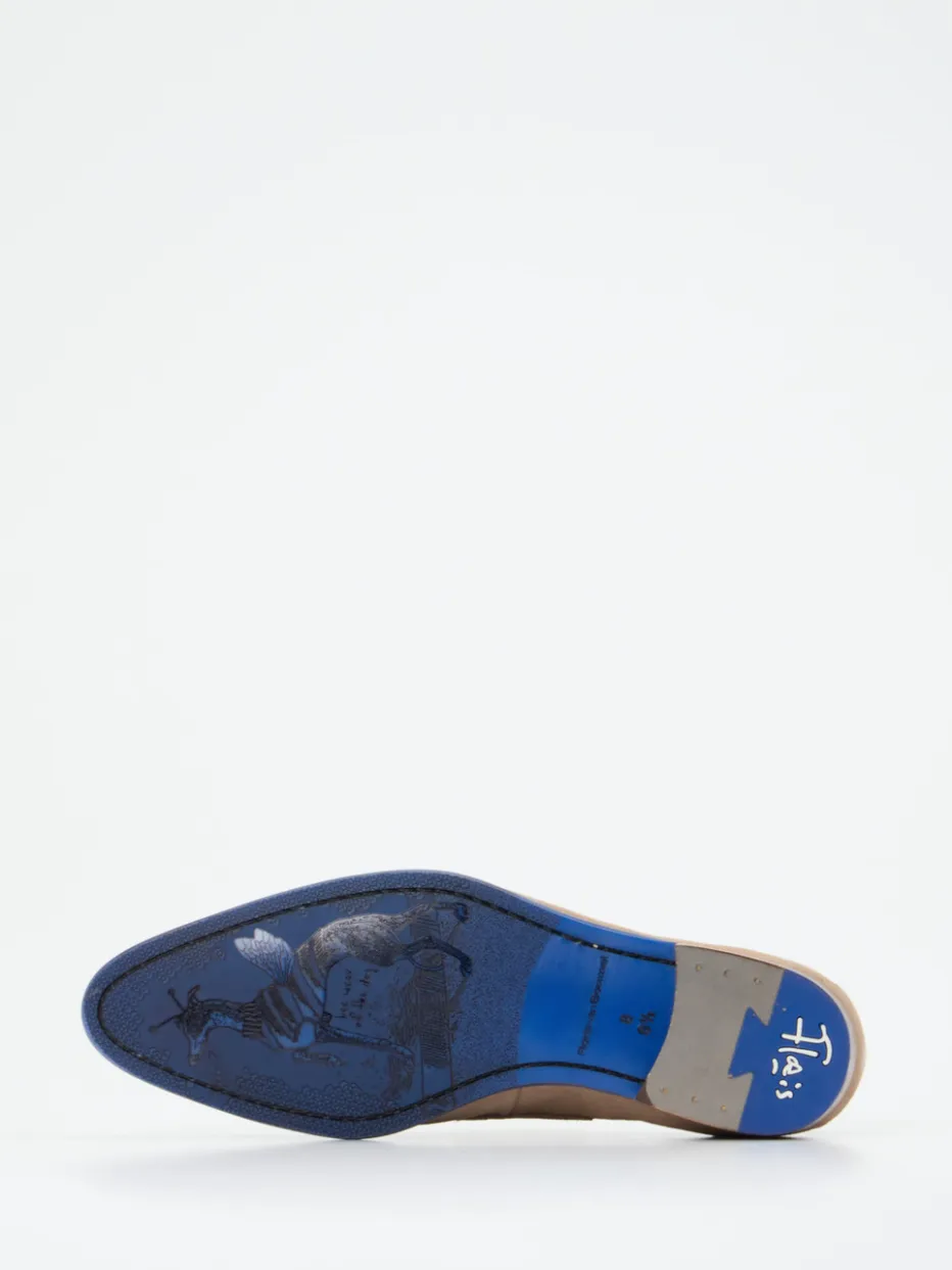 Stilvolle Leichtigkeit für sommerliche Anlässe.Der Herren-Loafer von Floris van Bommel vereint klassische Eleganz mit feinen Designdetails. Für Büro, Alltag oder formelle Sommeranlässe bietet das Modell aus hochwertigem Veloursleder in Sandbeige mit samtiger Struktur eine geschmackvolle Option. Ein geflochtener Einsatz im Vorderblatt erzeugt eine moderne Texturwirkung, während die kontrastierende blaue Gummisohle und ein mehrlagiger Absatz visuelle Akzente setzen. Das vollständig mit weichem Kalbleder gefütterte Innere mit gepolstertem Fußbett sorgt für exzellenten Tragekomfort. Die schmale Silhouette in Schlupfform unterstreicht den minimalistisch-eleganten Stil. Florale Italianità trifft auf präzise Handwerkskunst – ein Loafer im Zeichen von Quiet Luxury.