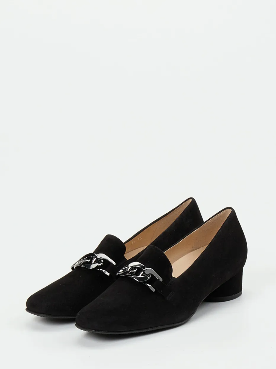 Understatement mit Designfokus.Der Damen-Loafer von Hassia überzeugt als klassischer Trotteur mit komfortabler Passform und moderner Eleganz. Ideal für Tage, an denen Komfort und Stil gleichermaßen gefragt sind. Aus hochwertigem Veloursleder gefertigt, zeigt sich das schwarzmatt strukturierte Obermaterial mit samtiger Oberfläche und klarer Linienführung. Die leicht spitz zulaufende Form harmoniert mit dem 2,5 cm hohen Blockabsatz und der schwarzen Gliederkette in Chrom-Optik als stilistischer Akzent. Dank Gummisohle und H-Weite angenehm zu tragen. Ein Modell, das den „Quiet Luxury“-Trend dezent umsetzt und sich besonders gut mit Tailoring oder reduziertem Strick kombinieren lässt. Zeitloses Design trifft auf hochwertige Verarbeitung aus dem Hause Hassia.