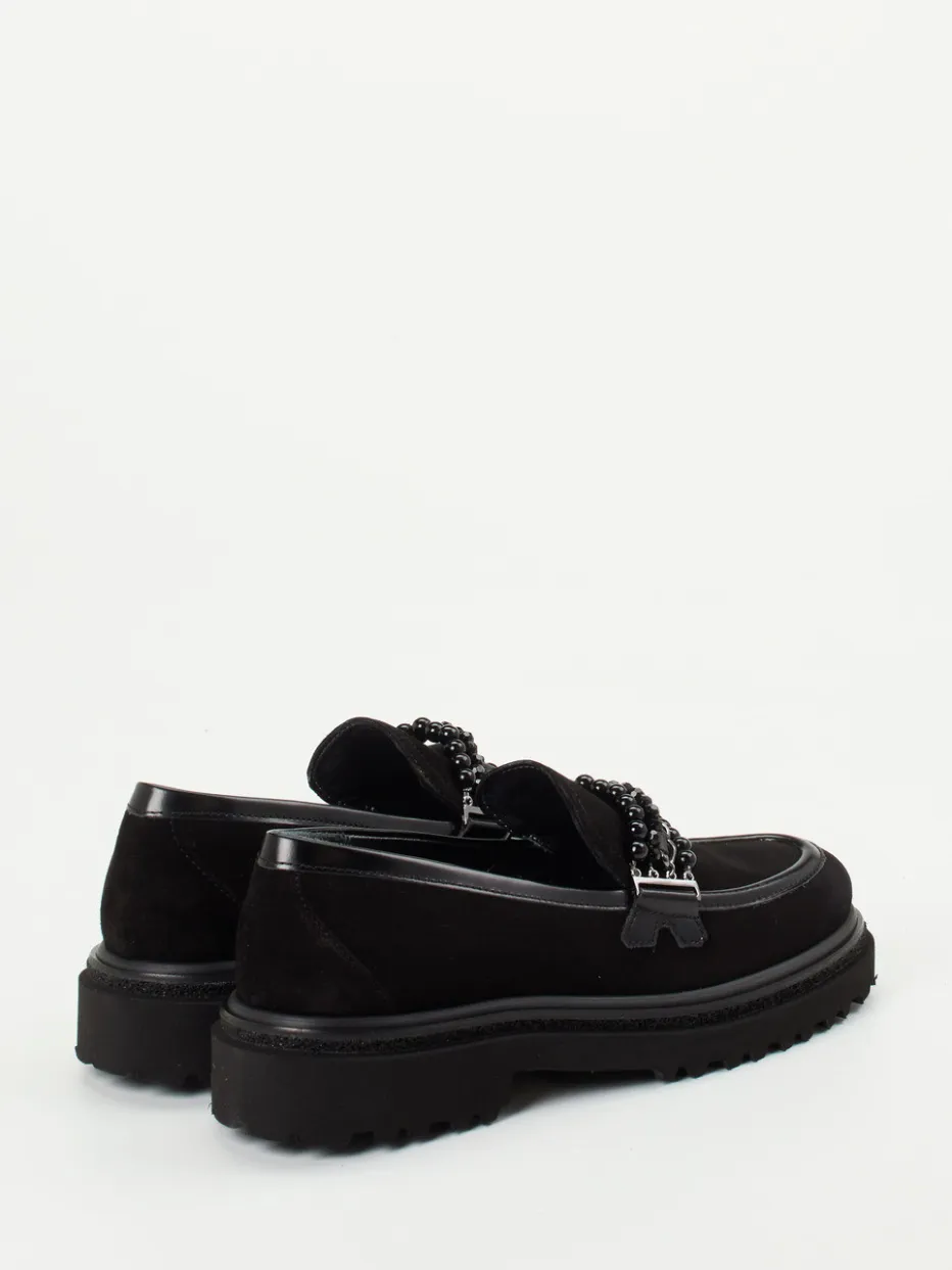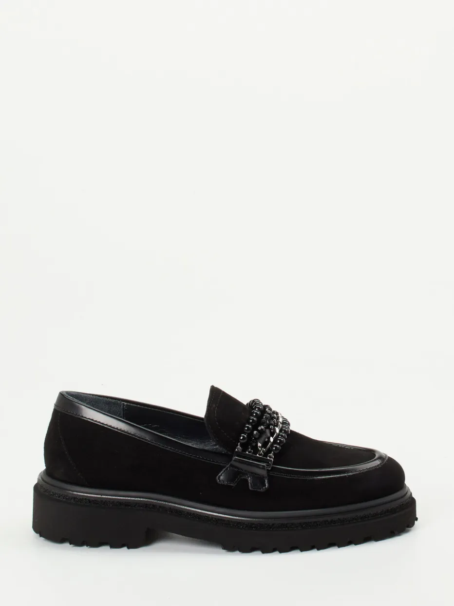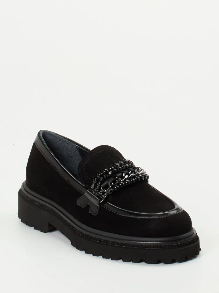 Ideal für moderne City-Looks im Herbst, verbindet der Loafer aus samtig angeschliffenem, schwarzem Veloursleder klassische Formgebung mit kraftvoller Silhouette. Tonige Glattlederpaspelierungen und eine glänzende Zierkette setzen dezente Highlights. Die voluminöse Profilsohle aus Leichtzellmaterial bietet sicheren Tritt und betont den Chunky-Loafer-Trend. Dank gepolstertem Fußbett und Kalblederfutter entsteht hoher Tragekomfort – auch bei längeren Tragezeiten. Die monochrome Gestaltung lässt sich vielseitig kombinieren, etwa mit einem Oversize-Mantel oder strukturierter Crossbody-Tasche.