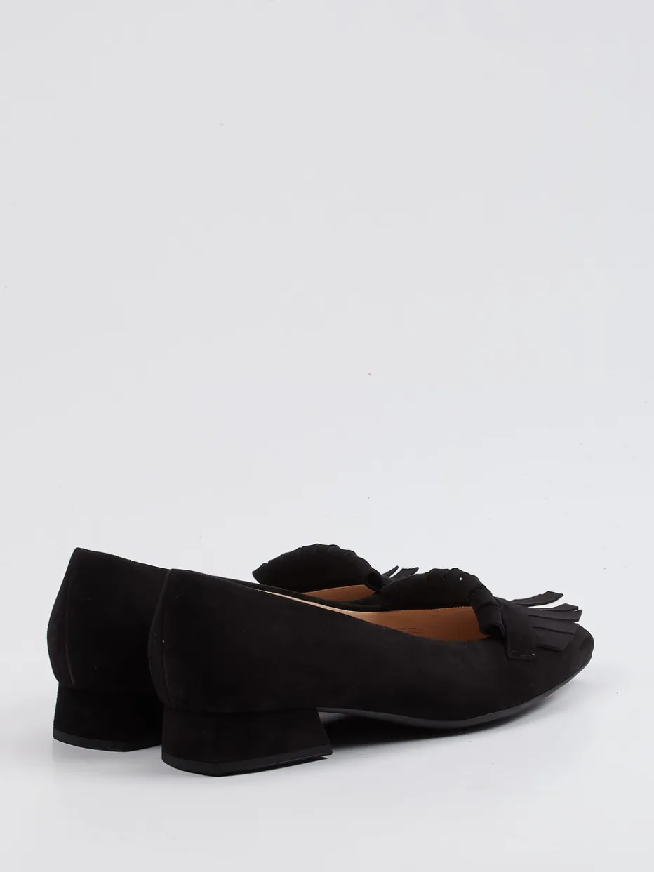 Die Kombination aus hochwertigem Veloursleder – samtig matt mit toniger Fransenapplikation – und tiefem Schwarz strahlt elegante Zurückhaltung aus. Die flache Silhouette mit Blockabsatz sorgt für sicheren Stand und bequemen Laufkomfort, eine weich gepolsterte Innensohle unterstreicht den angenehmen Trageeffekt. Das rutschhemmende Profil der Gummisohle rundet den Allrounder ab. Preppy-Look trifft hier auf Alltagstauglichkeit – perfekt kombinierbar mit Culottes, Blazern oder Langmänteln.