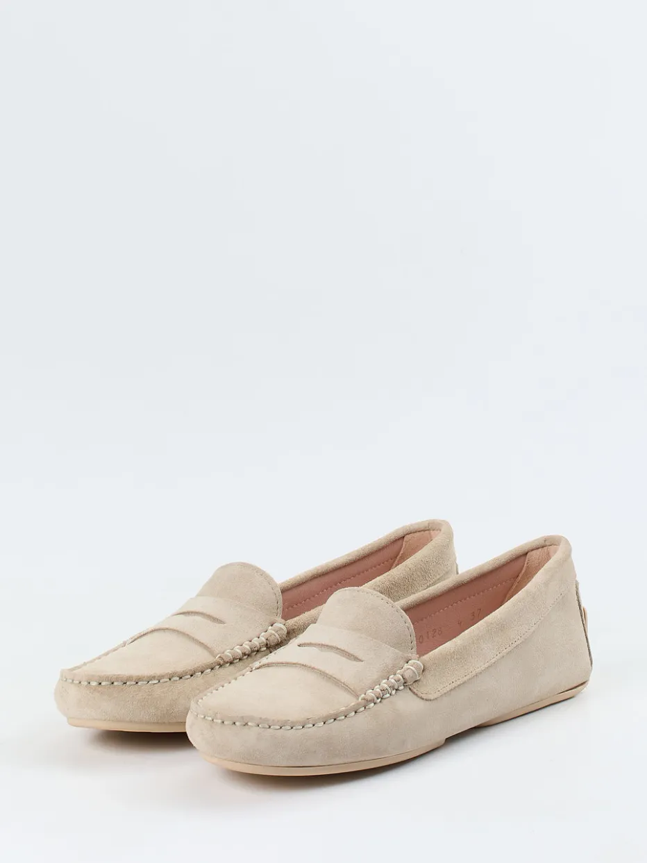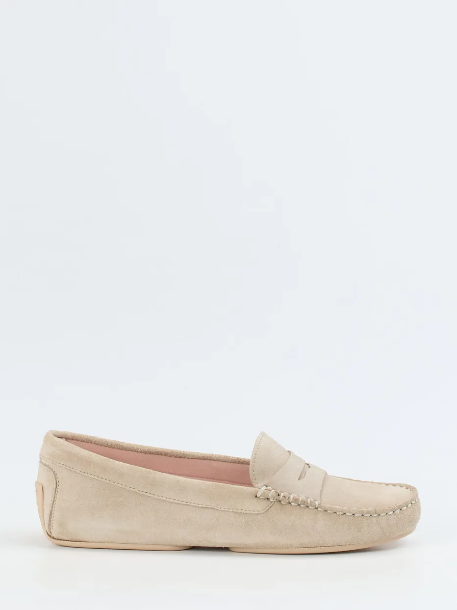 Sportlich zeigt sich die Marke Pretty Ballerinas durch diesen sommerlichen Loafer. Das beigefarbene Veloursleder ist ledergefüttert und sehr weich. Typisch sind die unterschiedlichen Steppnähte. Das wirkt lässig und sportiv. Der bequeme Gummiboden besteht aus zwei Kassetten, an der Ferse ist die Sohle im Stil der Autofahrerschuhe hochgezogen. Unverwechselbar wird der Slipper durch das dort eingeprägte Markenlogo.