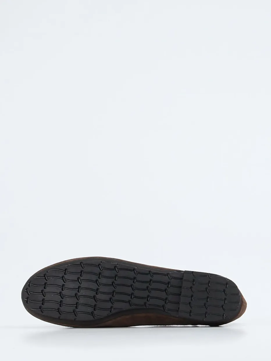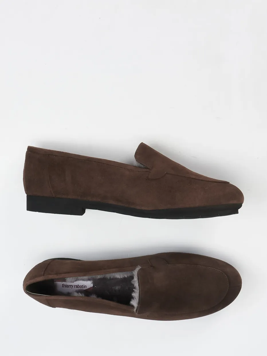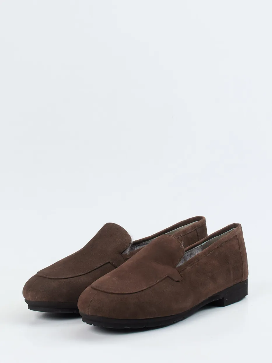 Der dunkelbraune Veloursleder-Schuh mit matter Oberfläche und Ton-in-Ton-Nähten überzeugt durch seine klassische, niedrig geschnittene Silhouette. Gefüttert mit echtem Lammfell in Mittelgrau sorgt er für angenehme Wärme – ideal für kühlere Tage. Die flexible, profilierte Gummisohle bietet guten Halt bei gleichzeitig hoher Beweglichkeit. Das schlupffreundliche Design mit Zunge und weichem Innenfutter fügt sich harmonisch in die Trends rund um „Quiet Luxury“ und „Soft Materials“.