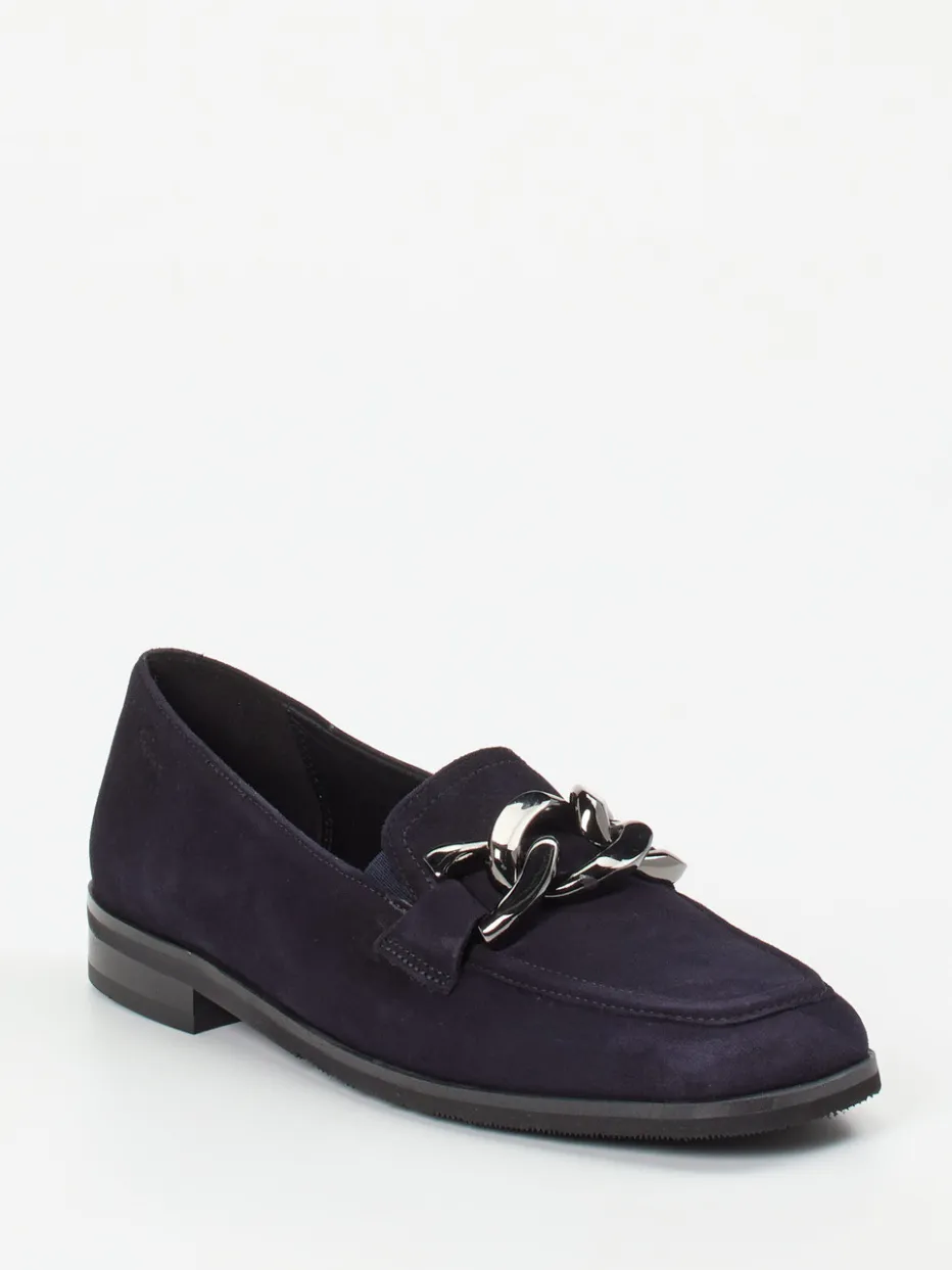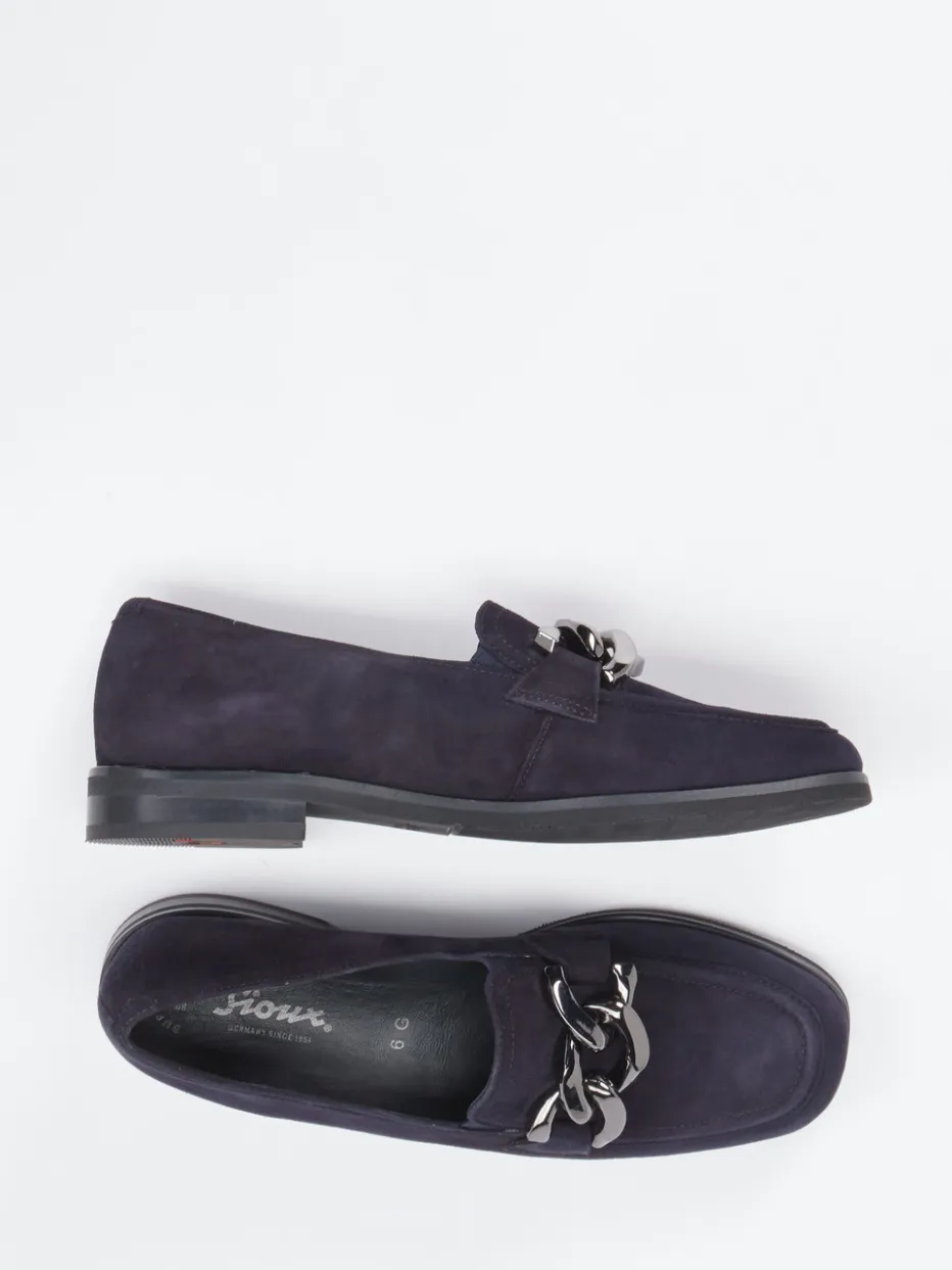 Eleganter Auftritt mit moderner Note.Sioux zeigt mit diesem Loafer für Damen eine stilvolle Interpretation des klassischen Slippers. Ideal für den Büroalltag oder smarte Freizeitkombinationen überzeugt das Modell aus nachtblauem Ziegen-Veloursleder mit samtig-matter Oberfläche. Die flache Silhouette auf Carrée-Leisten wird durch eine großgliedrige, silberfarbene Metallkette edel akzentuiert. Zwei Elasteinsätze erleichtern den Einstieg, während das gepolsterte Supersoft-Fußbett zusammen mit der flexiblen Gummisohle Komfort garantiert. Minimalistische Ästhetik trifft bei diesem Modell auf aktuelle „Quiet Luxury“-Strömungen. Ein souveräner Begleiter für vielseitige Business- und Casual-Looks mit charaktervollem Stil.