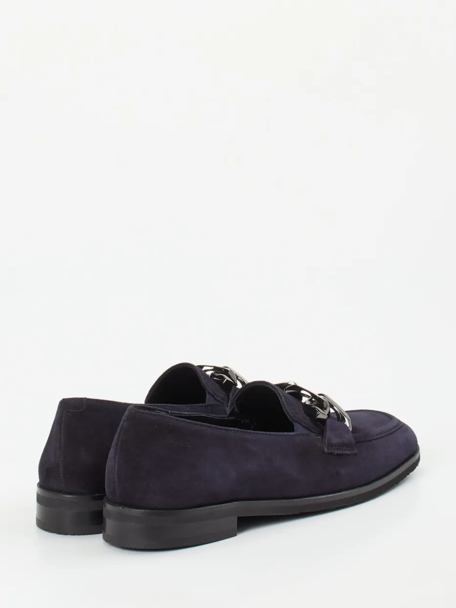 Hochwertiges Ziegen-Veloursleder, ein bequemer Carrée-Leisten und eine glänzende Metallkette verbinden sich bei diesem Loafer stilvoll mit modernem Minimalismus.