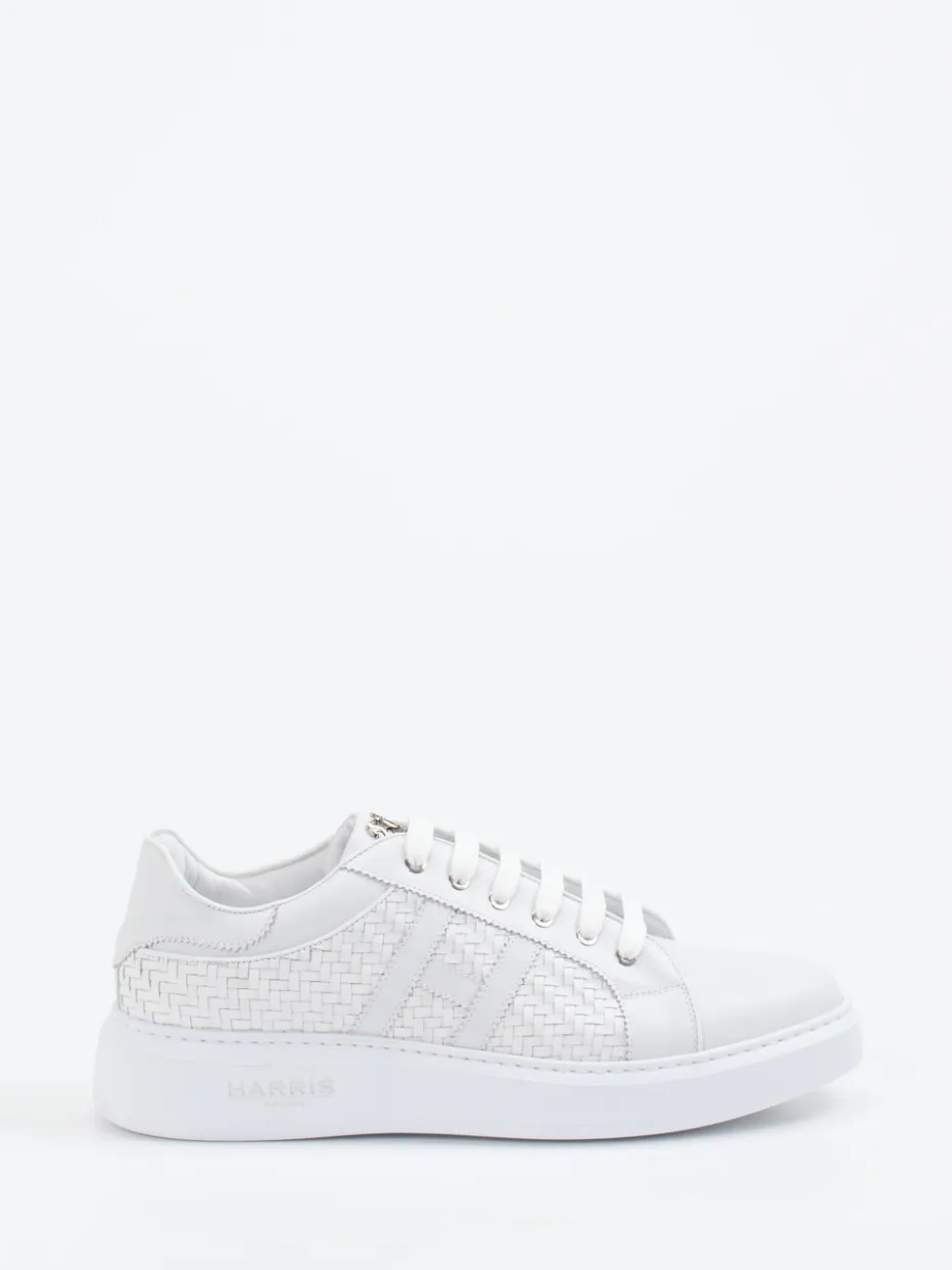 Feine Struktur, starker Auftritt.Der Florentiner Herrenschuh-Spezialist Harris bringt mit diesem Low-Top Sneaker einen stilvollen Akzent in die urban inspirierte Casualwear. Ein monochromes Highlight für den Alltag: Der Sneaker aus weiß-grauem Kalbleder vereint glatte Flächen mit einer seitlichen Flechtstruktur. Details wie silberfarbene Ösen, ein Metall-Emblem an der Zunge und ein geprägtes Markenlogo setzen dezente Akzente im Sinne des Quiet-Luxury-Trends. Die abgerundete Silhouette, die angenehm gepolsterte Innenverarbeitung mit Lederfutter sowie die profilierte Gummisohle sorgen für hohen Komfort in Freizeit und Business. Ideal zu monochromen Looks mit Strukturspiel. Handwerkskunst aus Italien für puristische Stil-Sicherheit.