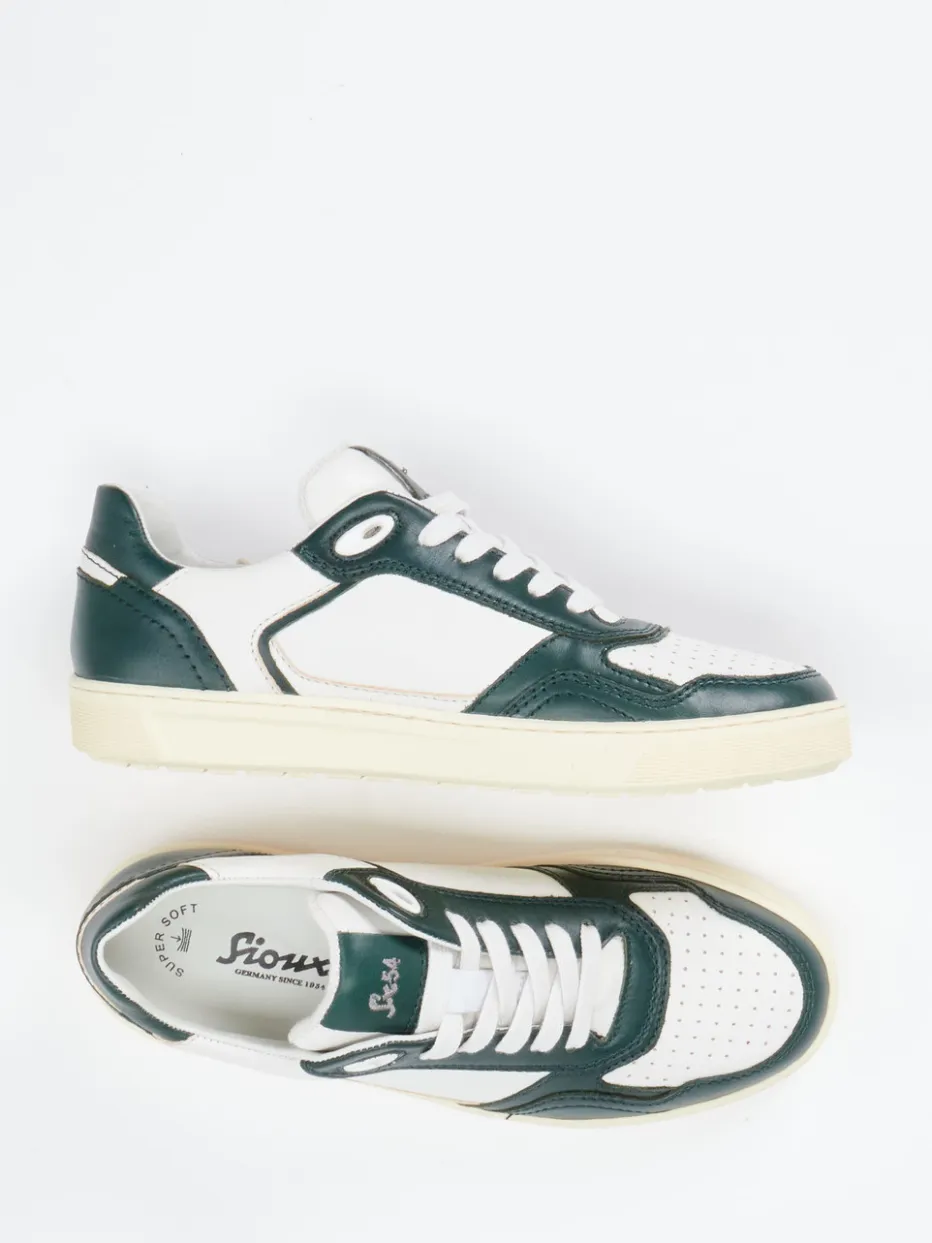 Retro-Flair trifft Alltagstauglichkeit.Sioux präsentiert einen modischen Low-Top-Sneaker für Unisex-Styling mit entspannter Silhouette. Ideal für einen aktiven Tag in der Stadt oder auf Reisen: Helles Kalbleder mit glatter Oberfläche und tonigen Nähten wird durch dunkelgrüne Overlays kontrastreich ergänzt. Das perforierte Vorderblatt fördert das Fußklima und unterstreicht den sportlichen Stil. Gepolsterter Einstieg, Frottee-Innenfutter und herausnehmbares Supersoft-Fußbett sorgen für hohen Tragekomfort. Farblich abgestimmte Schnürsenkel und die rutschhemmende Gummisohle runden den Look funktional ab. Optimal kombinierbar mit Casual-Outfits im Streetwear-Stil. Ein komfortbetonter Retro-Sneaker mit markencharakteristischer Qualität und Balance aus Design und Funktion.