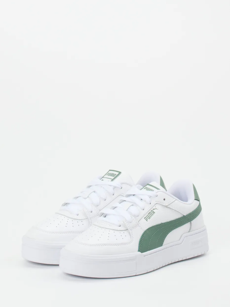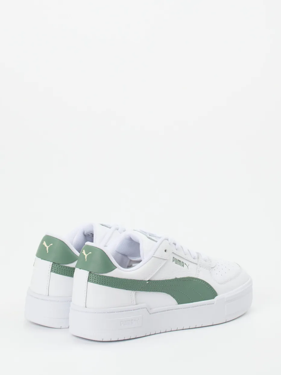 Frische Interpretation klassischer Sneakerformen.Puma zeigt mit diesem Low-Top-Sneaker ein sportiv-minimalistisches Design für Alltag und Freizeit. Die Glattleder-Oberfläche in reinem Weiß erhält durch den farblich abgesetzten Formstreifen in Salbeigrün sowie Prägungen an Ferse und Zunge dynamische Akzente. Gepolsterte Partien und das atmungsaktive Textilfutter sorgen für spürbaren Komfort, während die profilierte Gummisohle sicheren Halt bietet. Die klassische Silhouette passt zum angesagten Retro-Court-Trend und fügt sich mühelos in moderne Streetstyle-Looks ein. Ideal kombinierbar mit Jogpants oder monochromen Casual-Outfits. Ein Puma-Sneaker, der zeitlose Sportlichkeit mit urbaner Klarheit vereint.