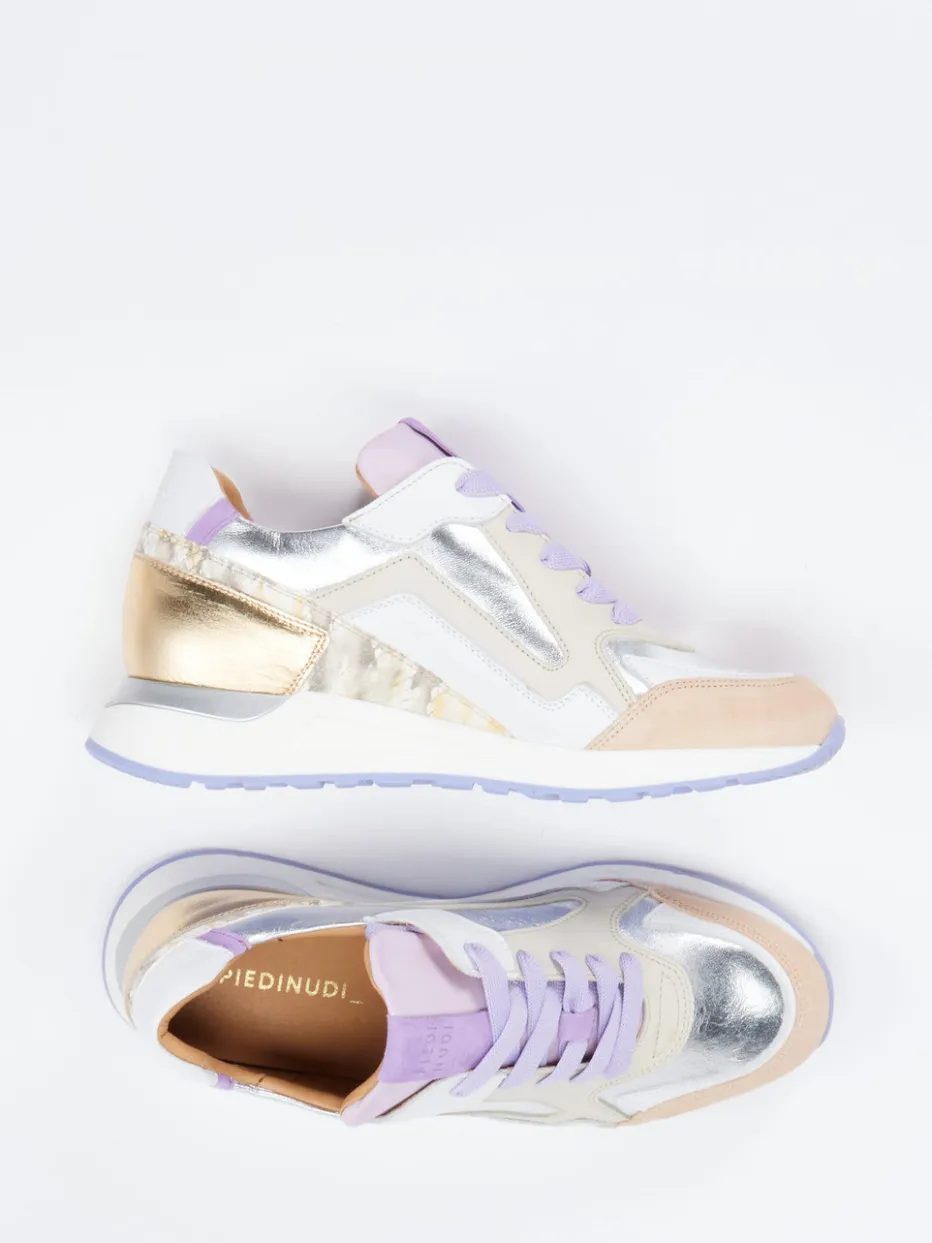 Für urbane Styles mit Statement-Charakter.Piedi Nudi präsentiert mit diesem Damen-Low-Top-Sneaker ein modisches Highlight für Alltag und Freizeit. Der Schuh kombiniert cremeweiße Grundtöne mit Flieder, Beige sowie silber- und goldfarbenen Glanzelementen. Der hochwertige Mix aus Kalbleder, samtigem Veloursleder und strukturbetontem Metallicleder wird durch eine sportlich-dynamische Silhouette und breite, fliederfarbene Schnürsenkel ergänzt. Eine gepolsterte Zunge, die verstärkte Ferse und die griffige Gummisohle mit lavendelfarbenem Profil sorgen für Laufkomfort – ideal für trendorientierte City-Looks. Metallic-Einsätze und pastellige Akzente verankern das Design in aktuellen Streetwear- und Pastell-Trends. Stil trifft Leichtigkeit – mit dem innovativen Look von Piedi Nudi.