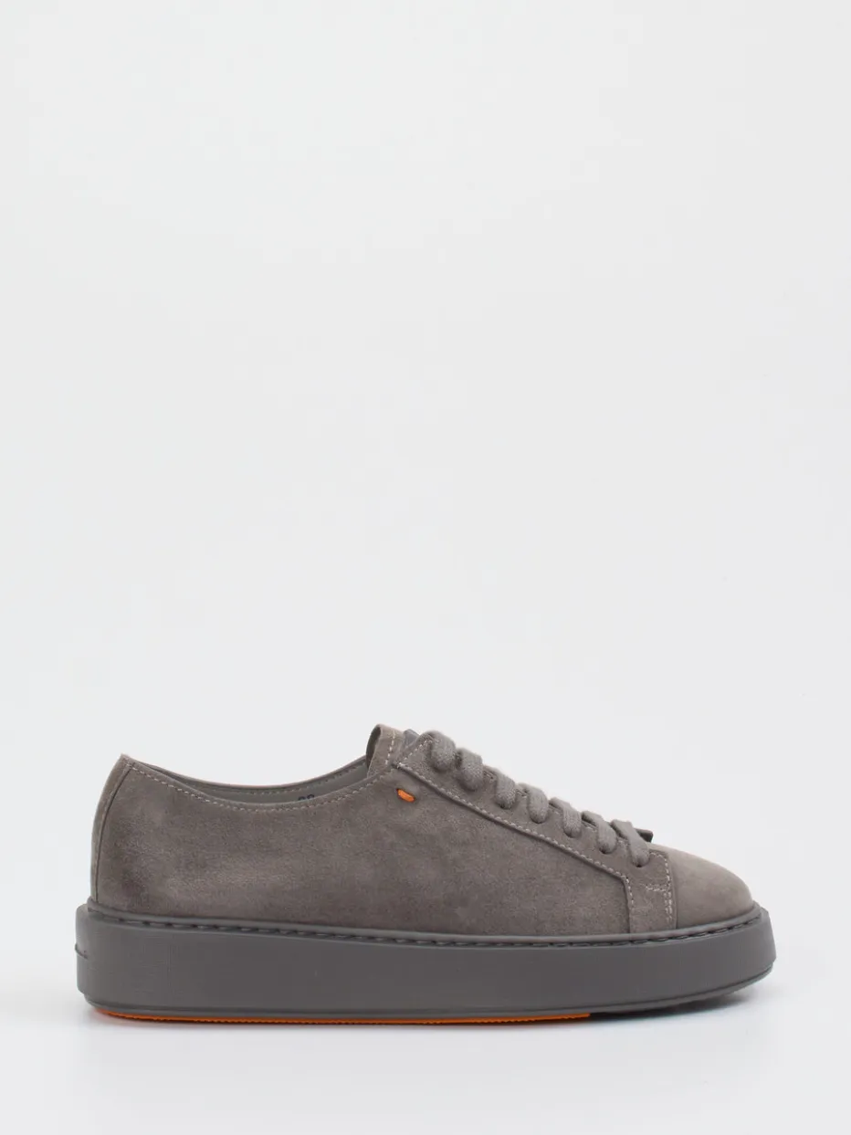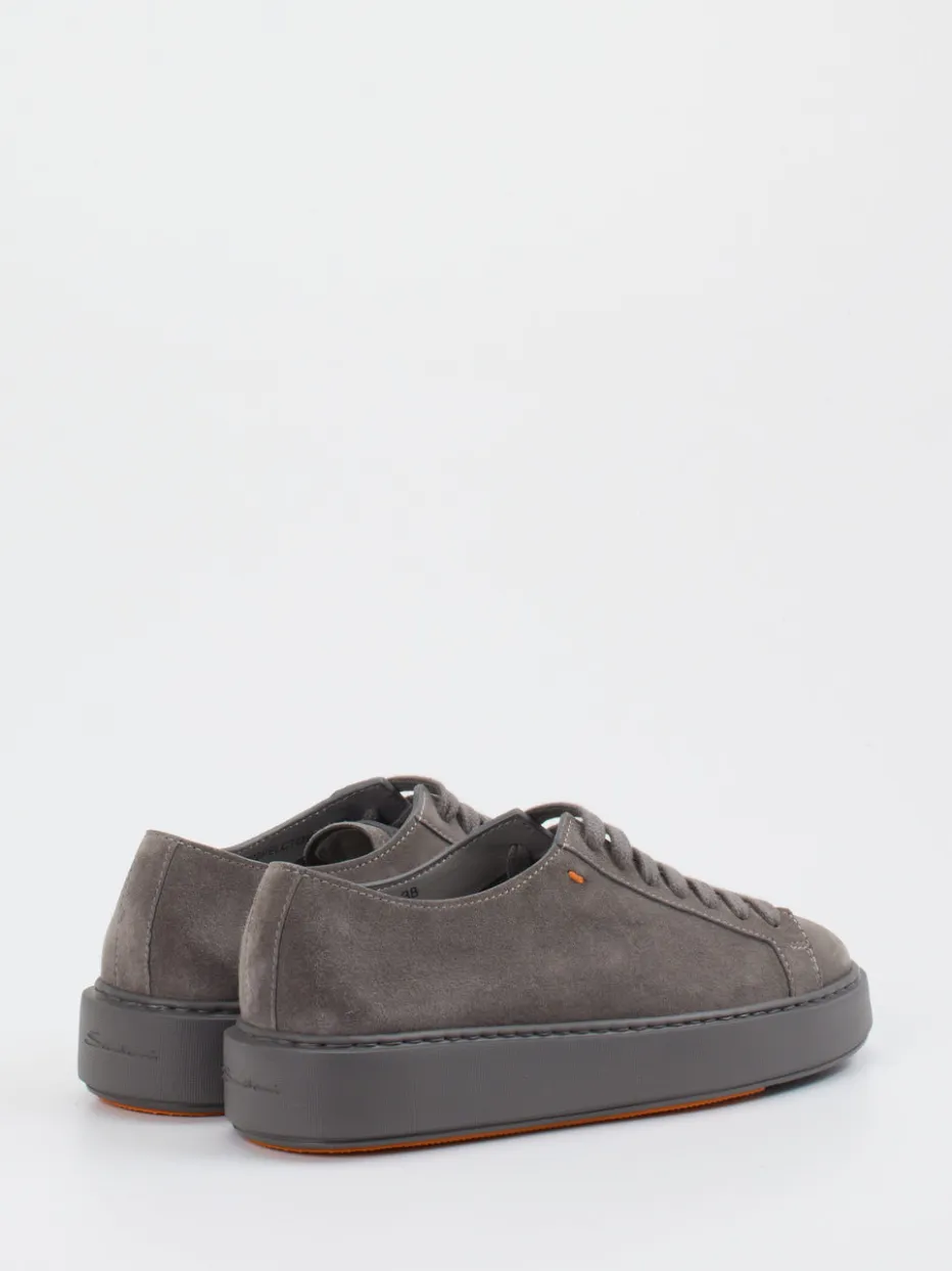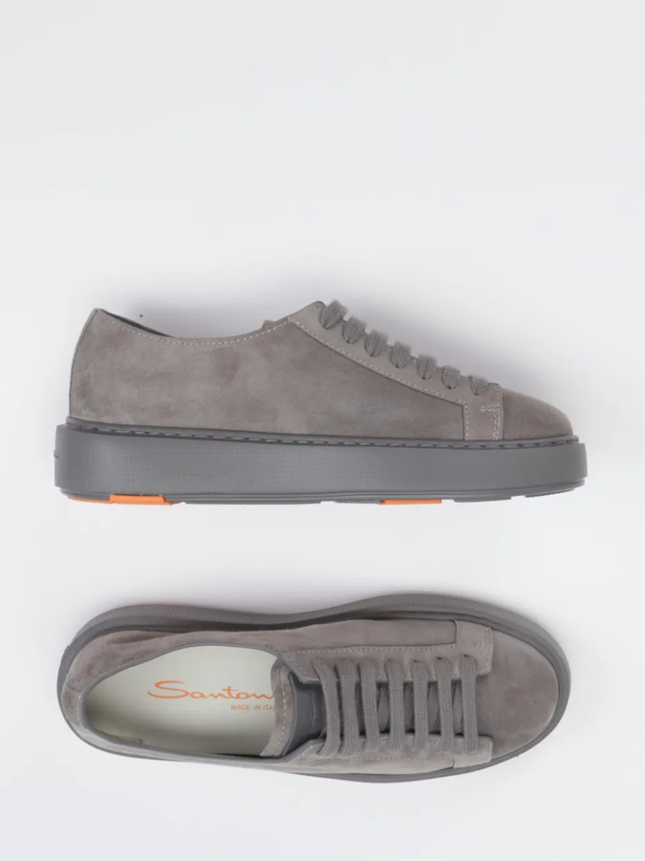 Santoni präsentiert einen Low-Top Sneaker aus Veloursleder in edlem Mittelgrau. Eine cleane Silhouette, kombiniert mit tonaler Schnürung, trifft auf eine charakterstarke Plateausohle mit orangefarbenem Akzent.
