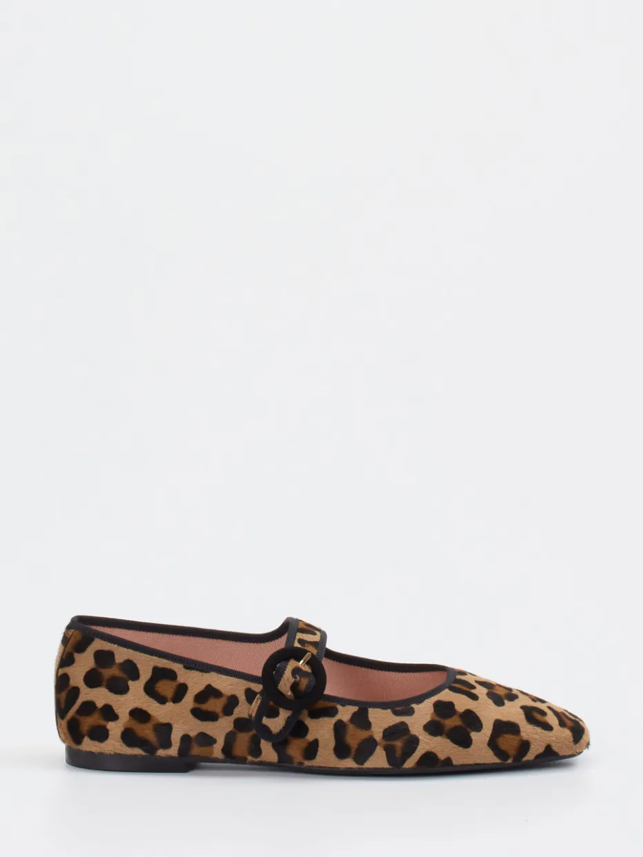 Dieser Mary-Jane-Ballerina aus samtigem Fellimitat in Leoprint-Optik vereint luxuriöse Haptik und modische Ausdruckskraft – ein stilvoller Akzent für trendbewusste Looks.