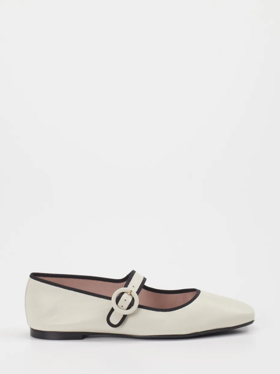 Die klassischen Mary Jane Flats überzeugen mit einem eleganten Cremeweiß, schwarzer Paspelierung und einer matten Glattlederoptik – zeitloses Design mit dezentem Retro-Charme.