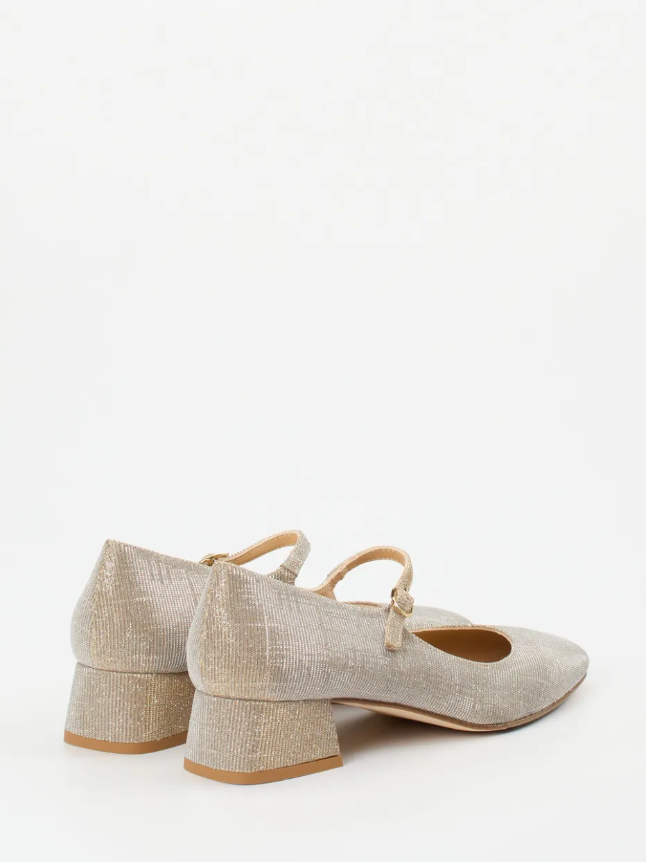 Für Events, Dinnerpartys oder elegante Empfänge bietet dieses Paar aus metallisch schimmerndem Textil mit eingearbeiteten Glitzerfäden in Champagner-Beige ein modisches Statement. Das innen verarbeitete Ziegenleder sorgt für ein angenehmes Tragegefühl, während die halbe Leder-/Gummisohle Stabilität verspricht. Der bequeme Blockabsatz in glitzernder Optik harmoniert ästhetisch mit dem Riemchen samt goldfarbener Schnalle. Als stilvolle Referenz an Vintage-Design und aktuelle Metallic-Trends macht der Schuh auch zur Nude-Strumpfhose oder Clutch in Goldton eine exzellente Figur.