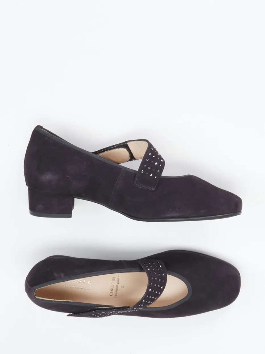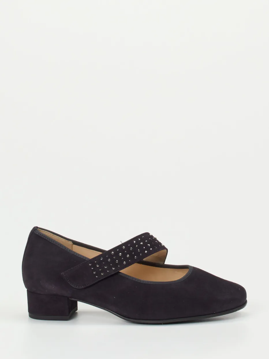 Komfortstarke Mary Janes von Hassia mit edlem Veloursleder und Swarovski-Ziersteinen. Ideal für den eleganten Alltag mit Einlagenkomfort und femininer Retro-Note.