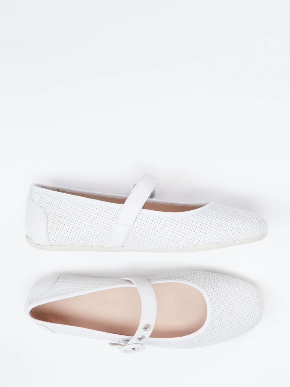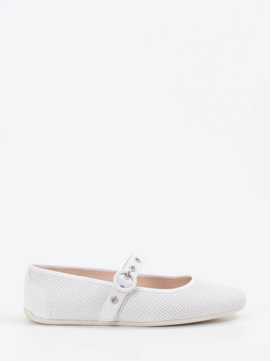 Candice Cooper interpretiert klassische Mary Jane Ballerinas in luftigem Weiß neu. Ideal für entspannte Sommertage verbinden diese Damen-Spangenpumps hochwertiges, geschmeidiges Lammleder mit einer perforierten Oberfläche für erhöhte Atmungsaktivität. Das flache, runde Design in Mattoptik wird durch die silberfarbene Schnalle mit Druckknopfverschluss stilvoll ergänzt. Eine verstärkte Fersenkappe und das weiche Lammnappa-Innenfutter bieten ein komfortables Trageerlebnis, unterstützt durch das gepolsterte Lederfußbett und die rutschfeste Gummisohle. Der Look fügt sich nahtlos in die „Quiet Luxury“-Ästhetik des Y2K-Trends ein – perfekt zu leichten Hosen und Canvas-Taschen. Komfort und Stil vereint in klarer Formensprache – typisch Candice Cooper.