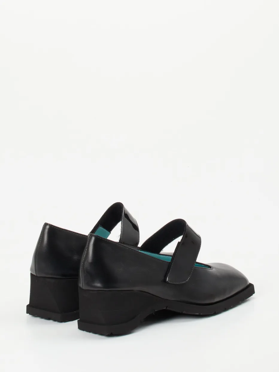 Für Tage mit vielen Schritten bietet dieser schwarze Spangenpumps aus weichem Lammleder sicht- und fühlbaren Komfort. Ein glänzender Riemen aus Lackleder setzt einen stilvollen Akzent und ermöglicht dank Klettverschluss eine exakte Weiteneinstellung. Der Keilabsatz mit profilierter Gummisohle bietet Stabilität – auch auf glatten Böden. Innen überrascht hellblaues Lammnappa mit luxuriösem Finish. Ideal für klassische Business-Looks sowie puristische Freizeit-Outfits. Besonders harmonisch zu Midirock oder Culottes.