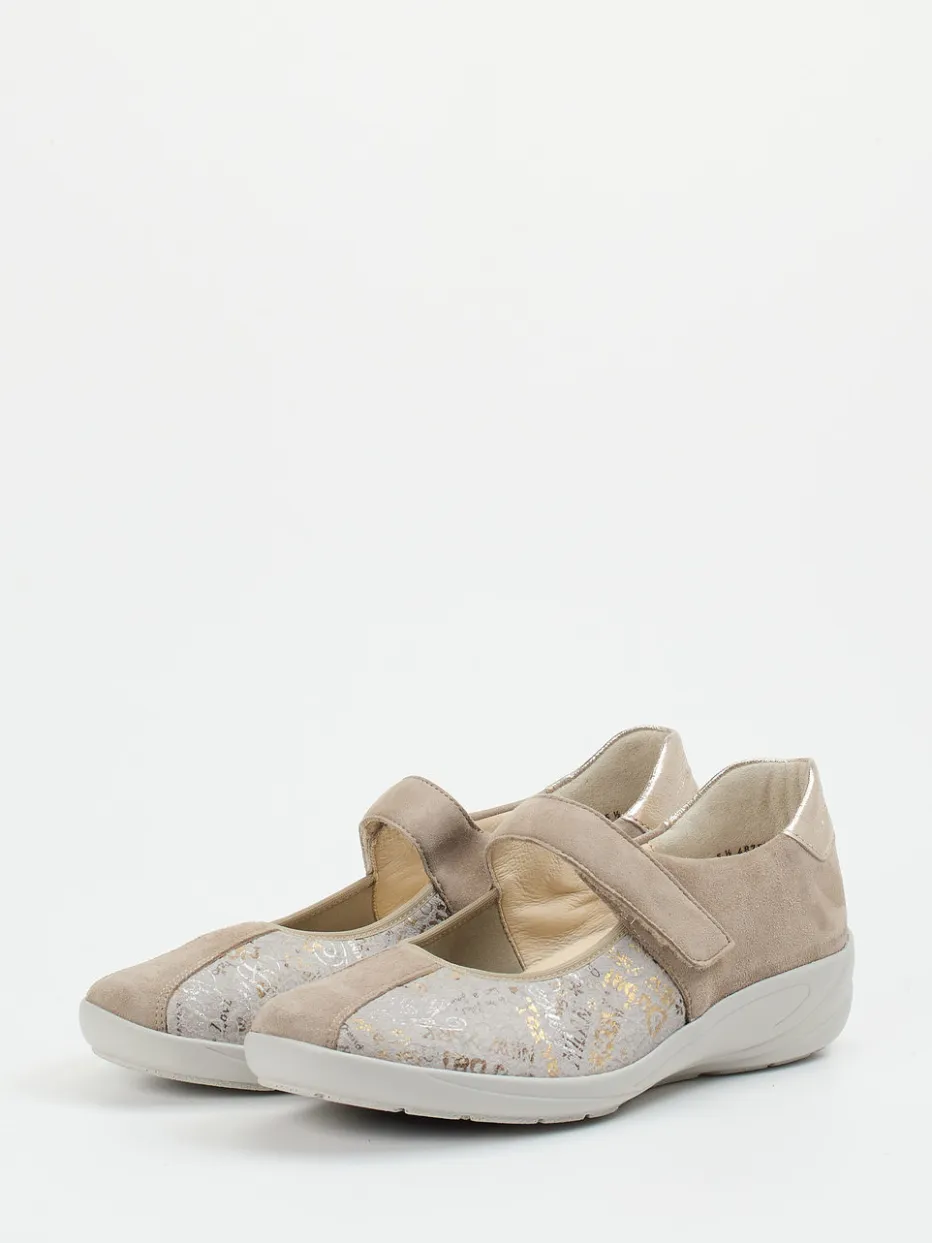 Komfort trifft dezente Raffinesse.Semler präsentiert bequeme Mary Janes für Damen in modischem Beigegrau. Ob im Alltag oder entspannt zu Hause – das ergonomische Fußbett dieser Spangenschuhe mit Weite H sorgt für dauerhaften Komfort. Gefertigt aus softem Veloursleder, wird das Obermaterial durch florale Textilflächen mit metallic schimmerndem Finish ergänzt. Goldfarbene Akzente, ein glänzender Fersenabschluss sowie der praktische Klettverschluss unterstreichen das komfortorientierte Design. Die leichte Luftpolstersohle aus PU ist flexibel und besonders gelenkschonend. Ideal zu naturfarbenen Strickjacken oder beigen Komforthosen. Semler steht für hochwertige Passform mit orthopädischer Leichtigkeit.