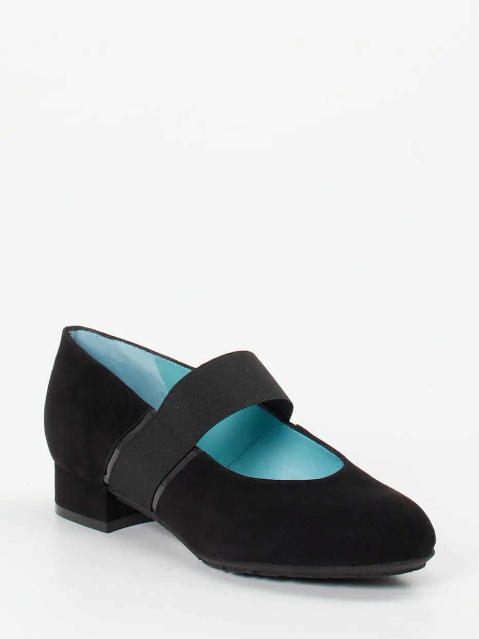 Zeitlose Linie mit modernem Akzent.Thierry Rabotin präsentiert stilvolle Mary Janes für Damen, gefertigt aus schwarzem Veloursleder. Perfekt für vielfältige Alltagssituationen – diese Spangenpumps verbinden eine klassische, rund geformte Silhouette mit einem elastischen Riemen für stabilen Sitz. Das samtig angeschliffene Veloursleder trifft auf einen Blockabsatz von 2,5 cm Höhe und eine rutschhemmende Gummisohle. Glänzende Lackakzente am Band verstärken den modischen Minimalismus. Innen verwöhnt weiches, himmelblaues Lammnappa. Retro trifft Komfort – ideal zu blickdichten Strumpfhosen oder monochromen Business-Looks. Eleganz und Laufkomfort, typisch Thierry Rabotin.
