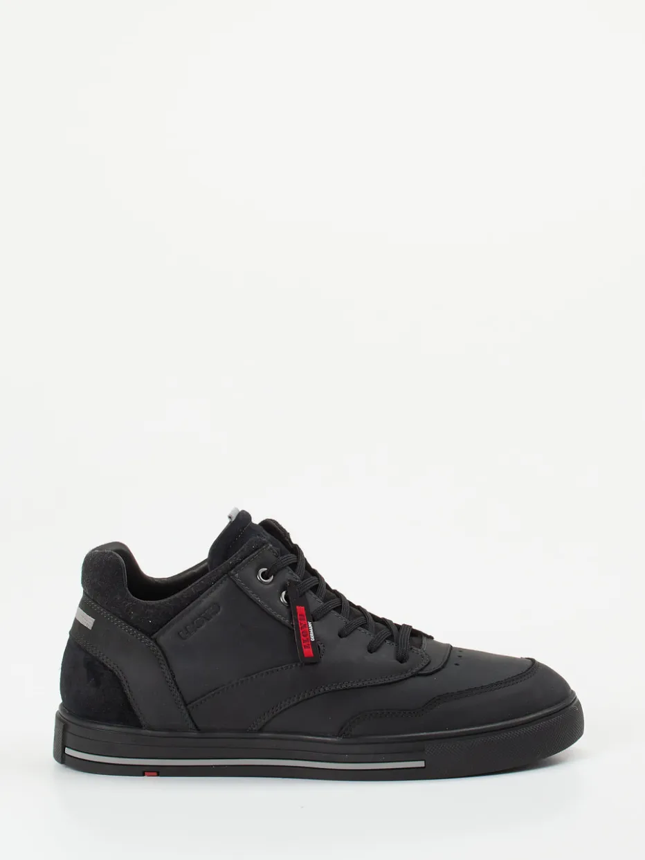 Urbaner Komfort trifft zeitlose Linie.Lloyd präsentiert diesen Herren-Mid-Top-Sneaker als stilsichere Ergänzung für die kühle Jahreszeit. Der Schuh überzeugt durch tiefschwarzes Kalbleder mit samtig-matter Oberfläche, ergänzt durch tonige Veloursleder-Overlays. Dezente Perforationen im Zehenbereich und ein gepolsterter Schaft sorgen für Komfort im Alltag. Auffällige Akzente wie die rote Label-Applikation und reflektierende Elemente an der Ferse definieren den maskulinen Look. Das wärmende Lammfellfutter macht ihn zum idealen Begleiter bei niedrigen Temperaturen. Ein stabiler Allrounder mit klarer Formensprache – funktional für Streetwear-Ensembles mit urbaner Note.