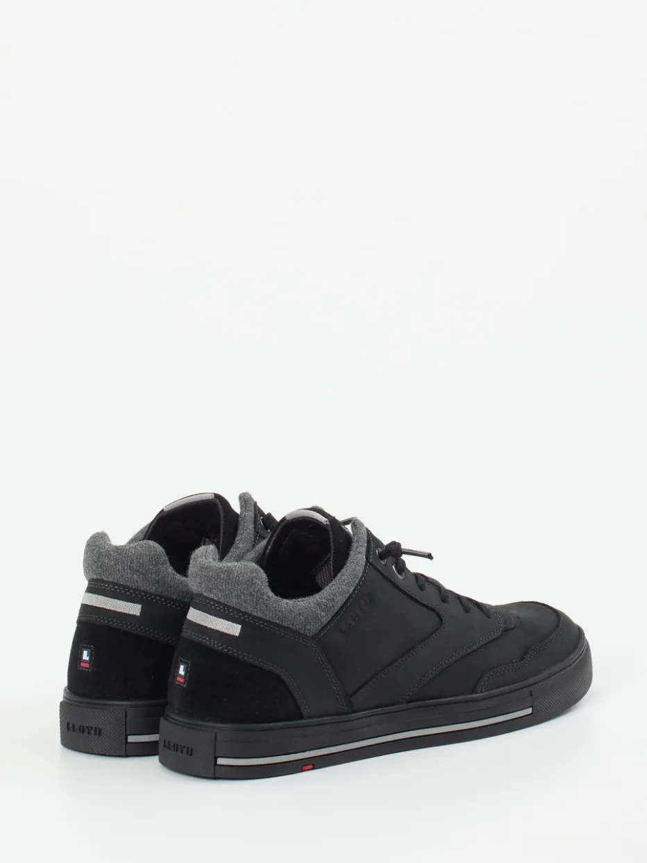Sportlicher Komfort für urbane Wege.Lloyd präsentiert einen modernen Herren-Mid-Top-Sneaker mit Streetwear-Präsenz. Ideal für entspannte Alltagswege: Das Modell ist aus hochwertigem, samtig angeschliffenem Nubukleder gefertigt und in tiefem Schwarz gehalten. Die klassisch-sportliche Mid-Top-Silhouette wird von reflektierenden Fersendetails und einer dezenten Logo-Prägung akzentuiert. Ein gepolsterter Schaftabschluss mit weichem Textilfutter sorgt für Komfort, während eine robuste Gummisohle mit griffigem Profil trittsicheren Halt bietet. Metallösen und die schlichte Schnürung unterstreichen den klaren, funktionalen Look. Perfekt zu Jogpants oder gefütterten Jacken. Lloyd verbindet zeitlosen Minimalismus mit spürbarem Komfort und urbaner Alltagstauglichkeit.