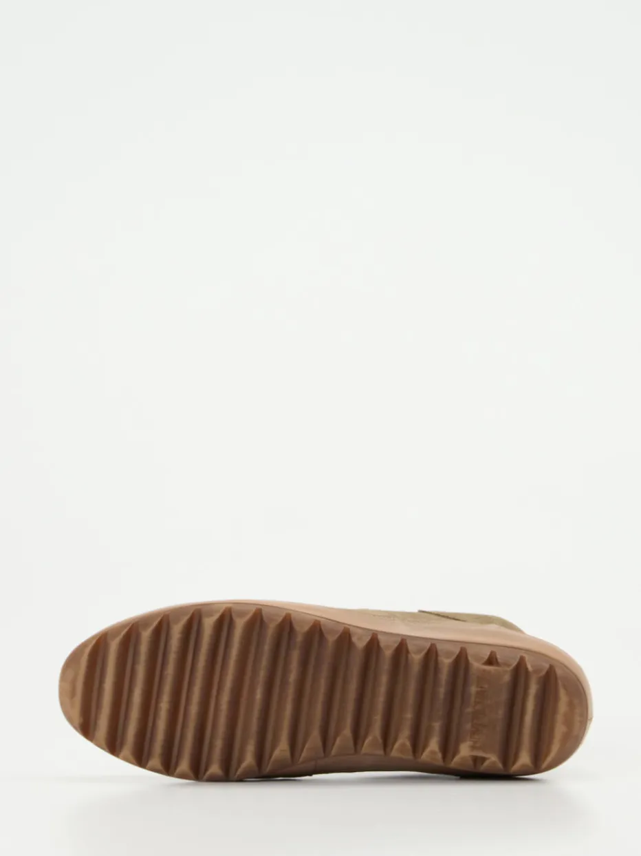 Minimalistisch mit urbanem Charakter.Der Mid-Top Sneaker von Franz Gustav verbindet Designkompetenz mit subtiler Funktionalität. Ideal für Spaziergänge durch die Stadt oder entspannte Wochenendtrips bietet das Modell aus taupefarbenem Veloursleder mit olivgrünen Akzenten eine kompakte Form mit matt-glänzender Oberfläche. Die Schnürung mit Metallösen sorgt für festen Halt, während die stark profilierte Gummisohle und der gummierte Zehenschutz funktionale Sicherheit gewährleisten. Dezente Ton-in-Ton-Nähte und ein geprägtes Markenlogo unterstreichen die minimalistische Ästhetik – perfekt für moderne „Quiet Luxury“-Outfits. Hochwertige Lederverarbeitung mit urbanem Designverständnis – typisch Franz Gustav.