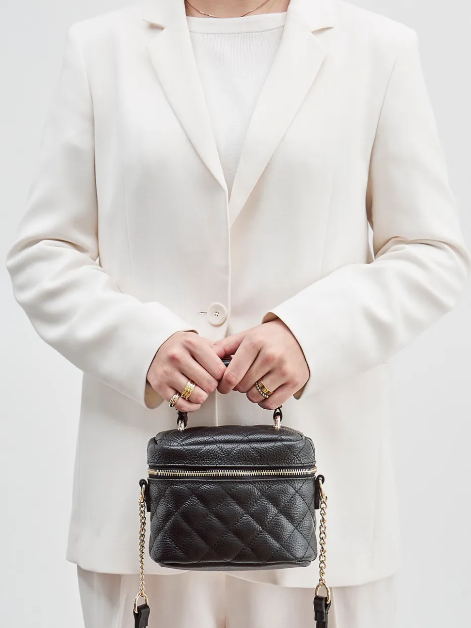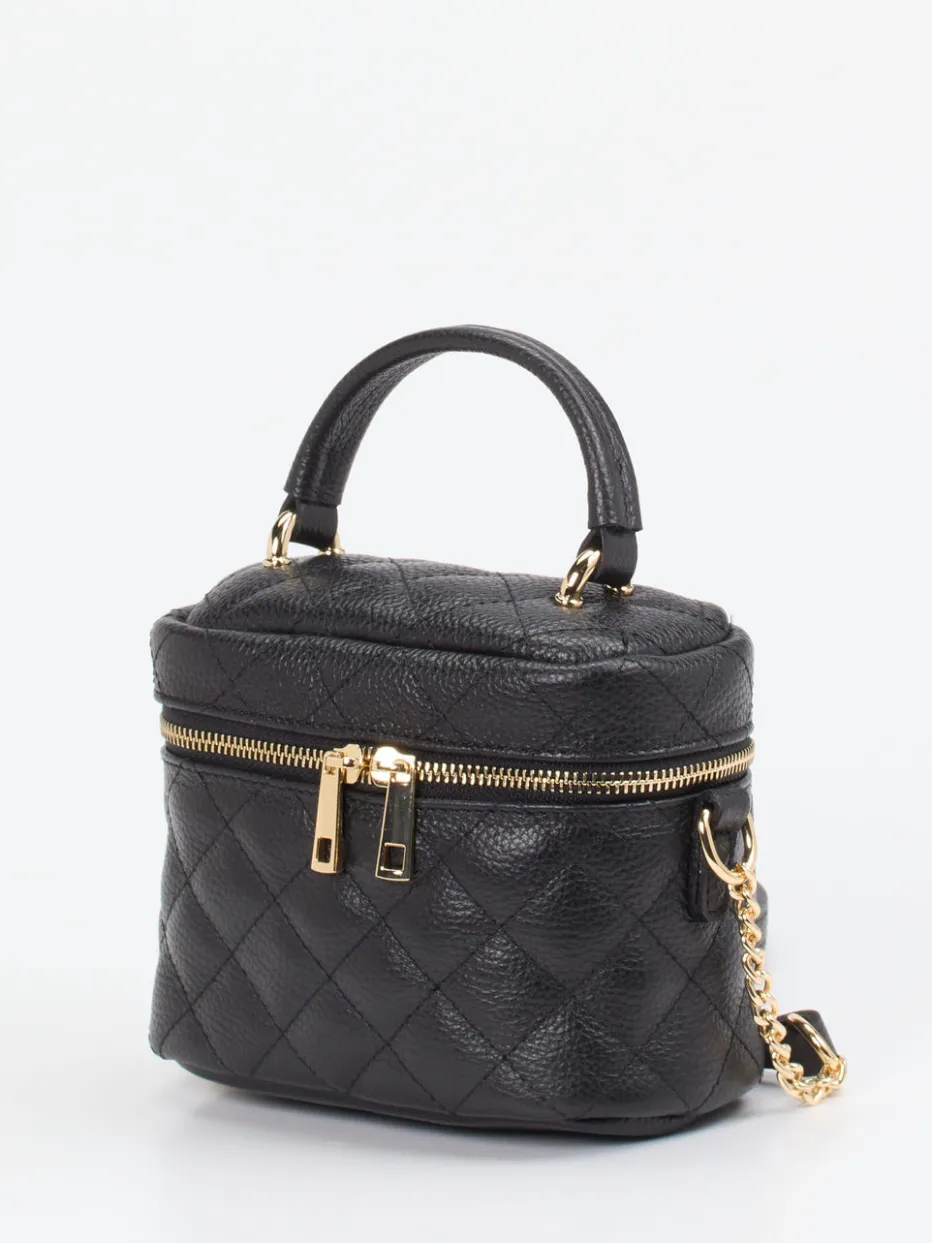 Kompakte Silhouette trifft auf stilvolle Details: Die schwarz gesteppte Minitasche von Marlon Firenze verbindet elegantes Kalbleder mit goldfarbenen Akzenten.