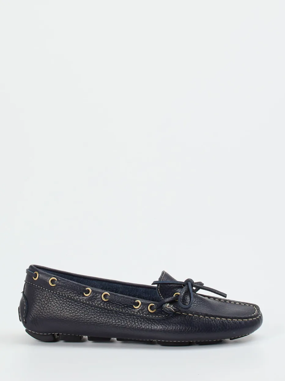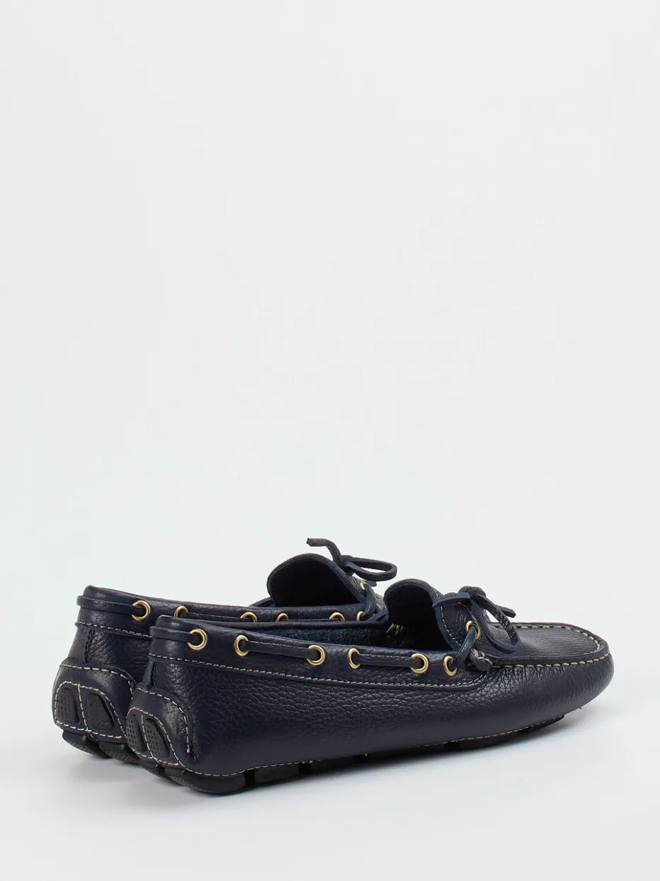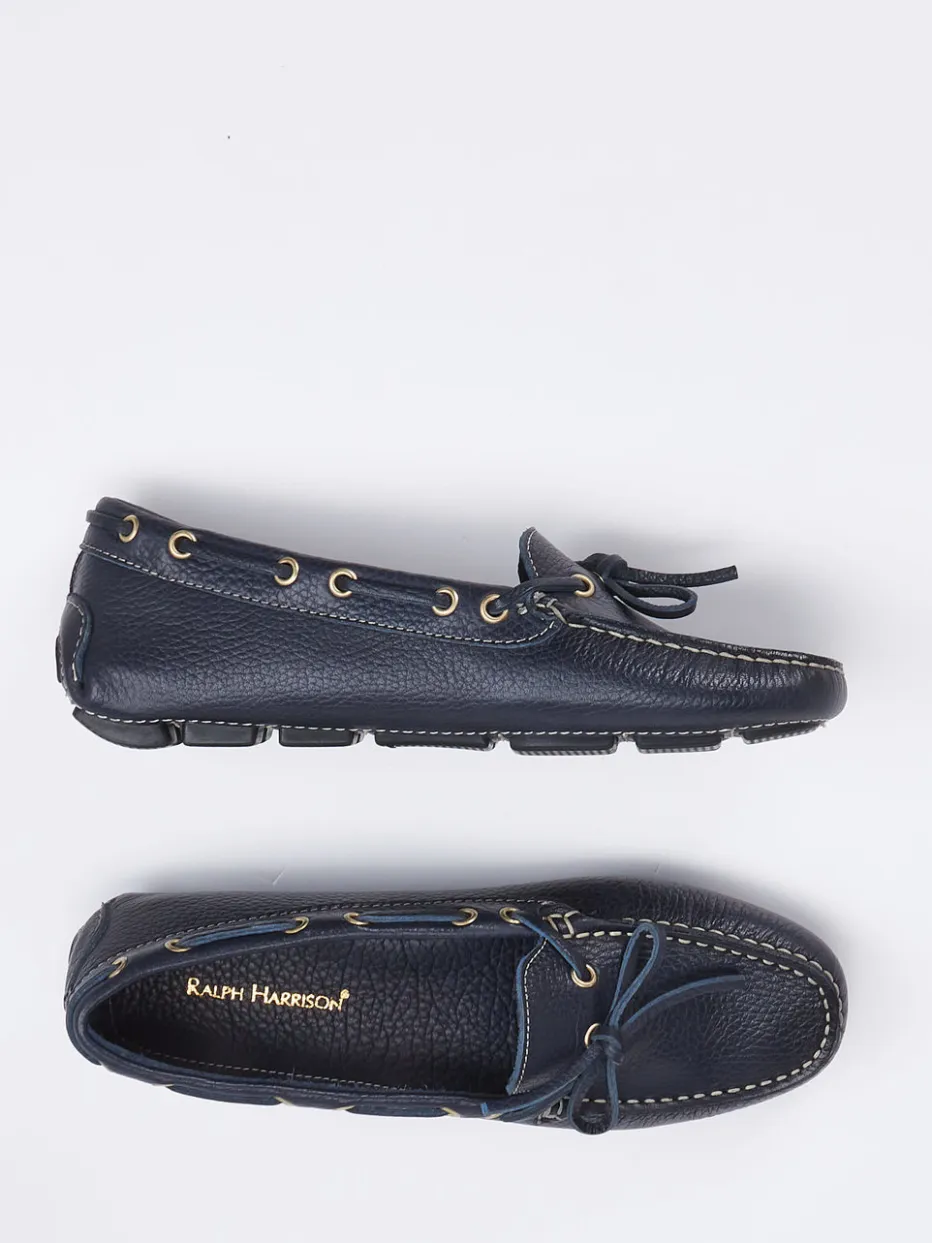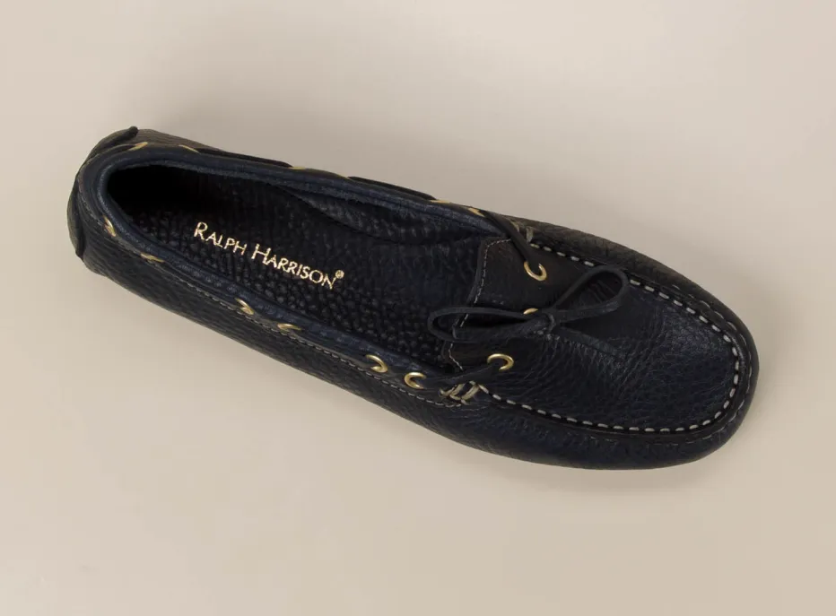 Flexibel, weich und leicht sind die Attribute dieses ledergefütterten Mokassins der Marke Ralph Harrison. Das sportlich genarbte Kalbleder ist dunkelblau. Typisch für den Stil der Bootsschuhe ist der umlaufende Senkel. Die großen, goldfarbenen Ösen schmücken und geben Glanz. Die Sohle ist an der Ferse hochgezogen und besteht aus schwarzen Gummikassetten. Mit diesem Mokassin finden Sie ein unkompliziertes Accessoire für sommerliche Tage.