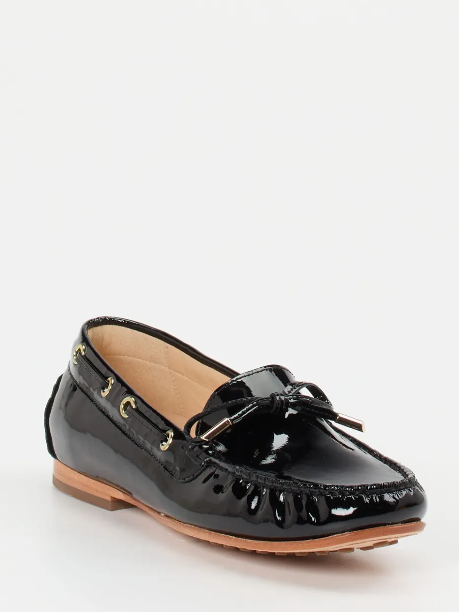Perfekt geeignet für den Büroalltag oder elegante Freizeitlooks bietet dieser Mokassin aus schwarzem, glänzendem Lamm-Lackleder mit goldfarbenen Ösen und dekorativer Schleife eine harmonische Einheit aus Stil und Komfort. Das handwerklich gefertigte Modell ist ledergefüttert, verfügt über ein weiches Wechselfußbett und eine lederbezogene Noppensohle mit griffigem Profil, das bis über die Ferse reicht. Die klassische, flache Silhouette und der Schlupfeinstieg betonen die stilvolle Leichtigkeit des Designs. Ideal zu Chinohosen oder monochromen Outfits kombinierbar.