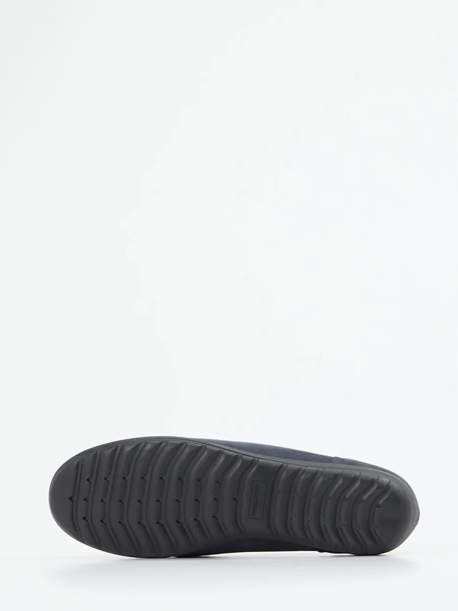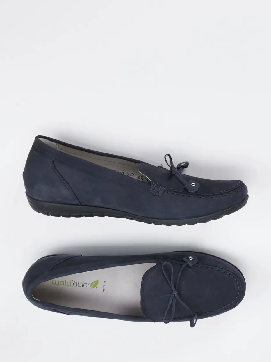 Komfort trifft auf lässige Ästhetik.Waldläufer steht für hochwertige Bequemschuhe – dieser Damen-Mokassin überzeugt im Alltag ebenso wie beim Entspannen zu Hause. Das dunkelblaue Nubukleder ist samtig angeschliffen und wirkt zugleich zurückhaltend und edel. Die klassische flache Silhouette mit Zierschleife, Ton-in-Ton-Nähten und dezenter Mokassinnaht betont die minimalistische Linienführung. Das weich gepolsterte, herausnehmbare Fußbett und die breite Passform (Weite H) erhöhen den Tragekomfort spürbar. Durch die profilierte Gummisohle ist ein sicherer Tritt gewährleistet. Stilistisch bewegt sich das Modell im Trendfeld „Quiet Comfort SS24“. Optimal kombinierbar mit Stretch-Jeans und Cardigans. Ein gelungenes Zusammenspiel aus Komfort, Qualität und entspannter Eleganz.