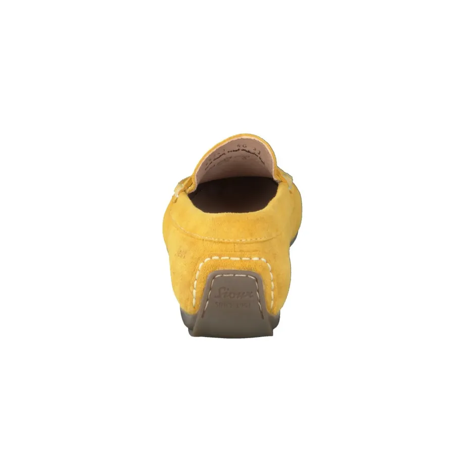 Sommerlicher Akzent für gepflegte Casual-Looks.Die Marke Sioux interpretiert den Damen-Mokassin mit der Form Carmona neu. Ideal für Büro und Freizeit: Das senfgelbe Veloursleder, samtig angeschliffen, verleiht dem Schuh eine hochwertige Haptik und visuelle Leichtigkeit. Weiße Kontrastnähte, ein toniger Riegel und die klassische Silhouette mit Mokassin-Naht unterstreichen das preppy Design. Innen sorgt ein angenehmes Textilfutter in Kombination mit einem lederbezogenen Wechselfußbett für Komfort. Die profilierte Gummisohle mit Flexkerben garantiert Alltagstauglichkeit. Gut kombinierbar zu Leinenhosen oder hellen Taschen. Stilvoll lässig mit dem bekannten Sioux-Tragekomfort.