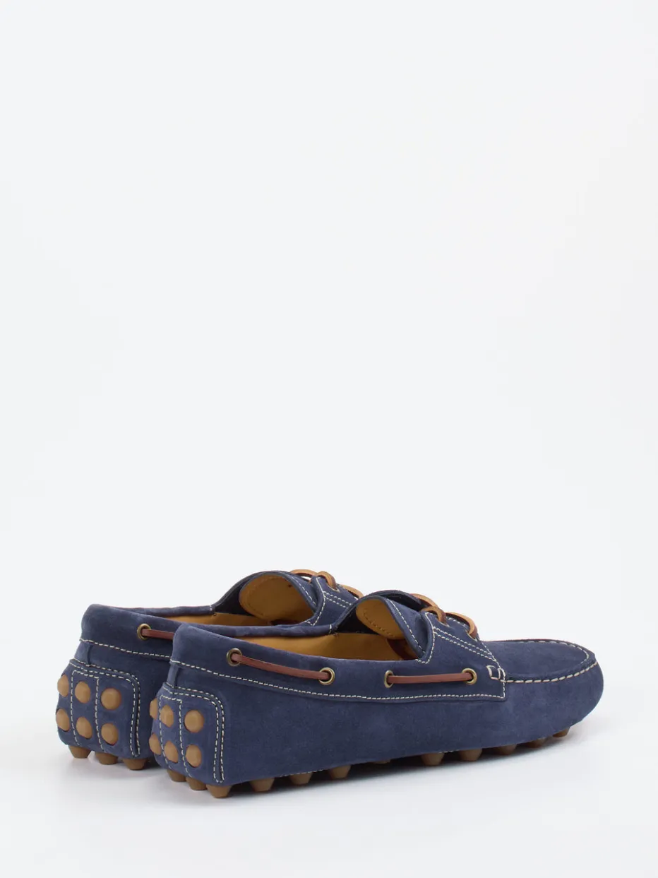Für den Spaziergang entlang der Promenade oder den gehobenen Casual-Look bietet das Modell Komfort und Stil: Gefertigt aus marineblauem Veloursleder mit samtig-weicher Oberfläche, zeigt der Schuh charakteristische Kontrastnähte in Beige und eine braune Zierschnürung. Die flache, gerundete Silhouette schmeichelt dem Fuß, während die honigfarbene Noppensohle für sicheren Tritt und Markenerkennung sorgt. Das strapazierfähige Kalblederfutter erhöht den Tragekomfort – optimal für sommerliche Freizeit-Aktivitäten. Stilistisch passt er hervorragend zu Chinos und leichten Baumwollhemden.
