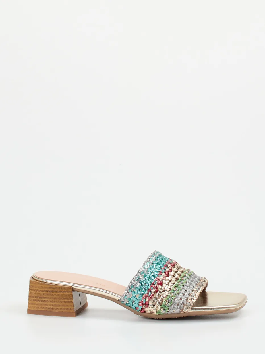 Diese Mules vereinen sommerliche Multicolor-Flechtstruktur mit einem eleganten Metallic-Finish und komfortablem Blockabsatz – inspiriert vom Boho- und Retro-Glam-Trend.
