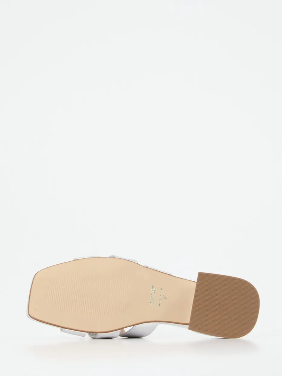 Glamour in seiner modernsten Form: Diese Mules verbinden Metallicleder mit farbiger Strassverzierung und bringen festliche Eleganz in modische Balance. Ideal für stilvolle Auftritte am Abend.