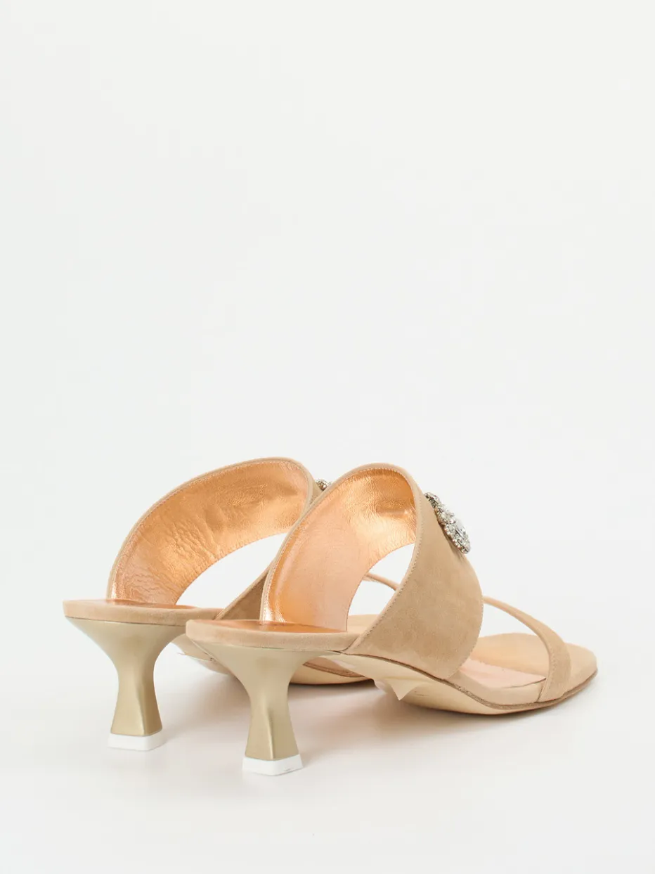 Ob stilvoller Empfang oder eleganter Stadtbummel – das beigefarbene Veloursleder mit samtiger Oberfläche wird durch breite Riemen und funkelnde Strassdetails akzentuiert. Innen überzeugt weiches Kalbleder mit leichtem Metallic-Schimmer und Polsterung. Die offene Silhouette, kombiniert mit dem skulptural geformten Kitten Heel in Goldoptik, folgt aktuellen Ornamentik- und Vintage-Trends. Die feine Ledersohle unterstreicht den anspruchsvollen Charakter. Ideal zu Seidenkleidern oder cremetonigen Tailor-Looks.