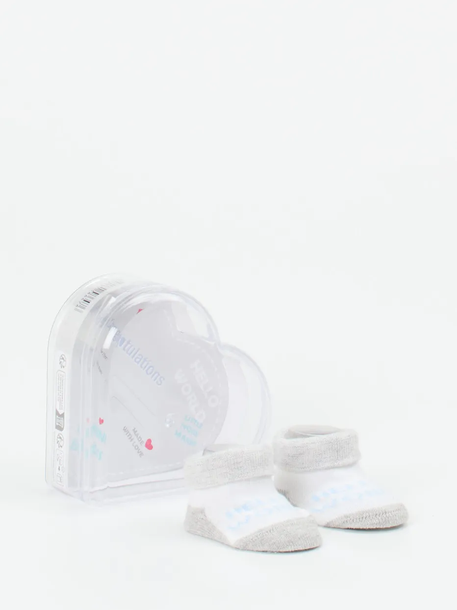 Sanfter Start im soften Design. Camano präsentiert liebevoll gestaltete Neugeborenen-Söckchen für die Alltagsmomente der Kleinsten. Aus weichem Textil gefertigt, zeigt sich das Design in Weiß mit hellgrauen Akzenten und hellblauem „HELLO WORLD“-Schriftzug. Der umgeschlagene Bündchenrand, abgesetzte Fersen- und Zehenpartien sowie die weiche Stricktextur unterstreichen den komfortablen Sitz. Die klassische Kurzsockenform in Schlupfausführung eignet sich ideal für zu Hause oder als Geschenk zur Geburt. Ein klarer Unisex-Look trifft auf angesagte Soft Pastels der Saison. Geliefert in herzförmiger Geschenkbox – mit liebevollem Stil für die ersten Abenteuer.
