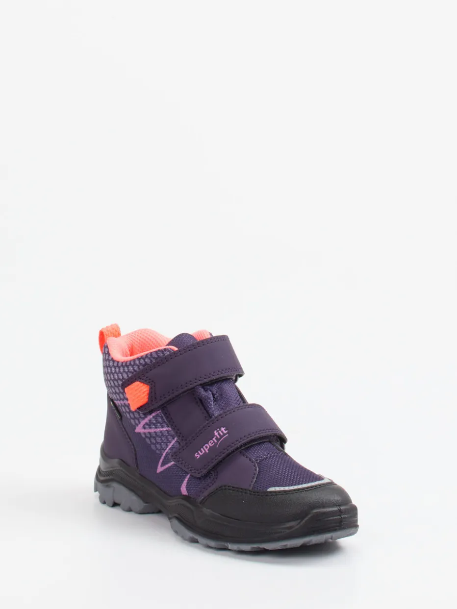 Bereit für große Abenteuer.Die Marke Superfit präsentiert robuste Outdoor-Boots für Kinder. Ideal für Spaziergänge im Regen oder Entdeckungstouren im Park: Das knöchelhohe Modell aus Synthetik mit matter Mesh-Struktur bietet durch die integrierte GORE-TEX®-Membran zuverlässigen Schutz vor Nässe. Die Kombination aus intensiver Dunkellila-Grundfarbe und auffälligen Koralle-Akzenten sorgt für einen frischen Color-Blocking-Look, unterstützt von reflektierenden Details und Logo-Print auf dem Klettverschluss. Die tief profilierte PU-Sohle fördert sicheren Halt auf unebenem Untergrund. Praktische Zuglasche und doppelte Klettverschlüsse erlauben eigenständiges Anziehen. Perfekt für Kinder, die Funktion und Komfort sportlich tragen wollen.
